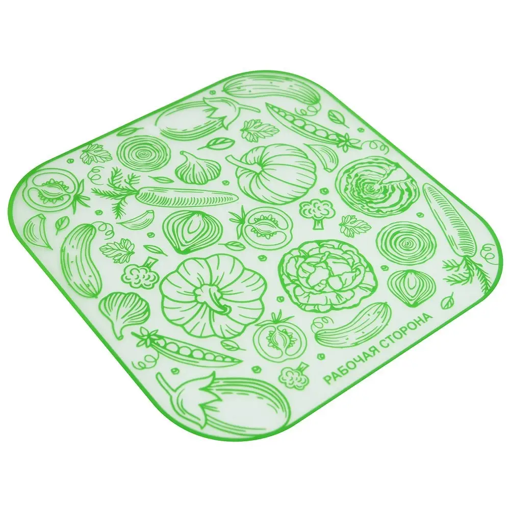 Доска разделочная – это отличный помощник на кухне для любой хозяйки. Доска предназначена для нарезки овощей, фруктов, сыра, хлеба, разделки мяса или рыбы, раскатки теста, а также ее удобно использовать как подставку для терок и слайсеров при шинковке овощей. Преимущество этой доски в том, что она гибкая, что очень удобно для перемещения продуктов. Просто возьмите изделие за края, аккуратно согните, чтобы вся нарезка оказалась посередине, затем наклоните и ссыпьте продукты в салатник, кастрюлю или любую другую емкость. Разделочная доска отлично подойдет для дома, дачи или пикника. Перед первым использованием и после каждого применения помыть в тёплой воде, можно с жидким моющим средством, сполоснуть проточной водой и просушить. Не рекомендуется мыть в посудомоечной машине.