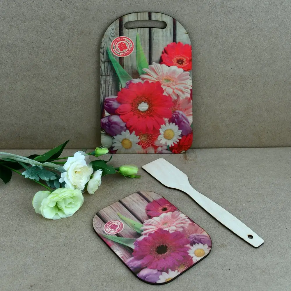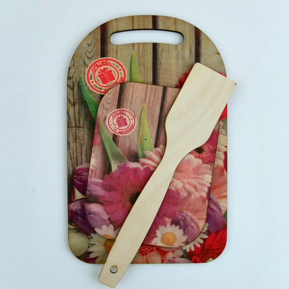 Декорированная, с одной стороны, доска может стать прекрасным подарком и достойным украшением интерьера кухни, столовой, гостиной. Подставка предназначена для защиты поверхности стола от пятен, царапин и обладает термоизолирующим свойством. Лопатка незаменима для перемешивания и переворачивания готовящихся блюд.