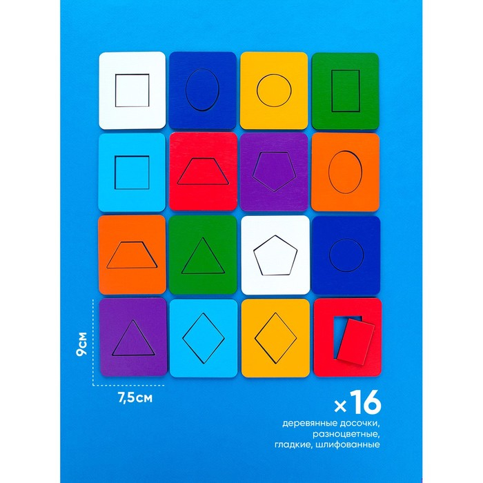 - 16 красочных досочек с геометрическими выемками: квадраты, овалы, круги, прямоугольники, ромбики, треугольники.