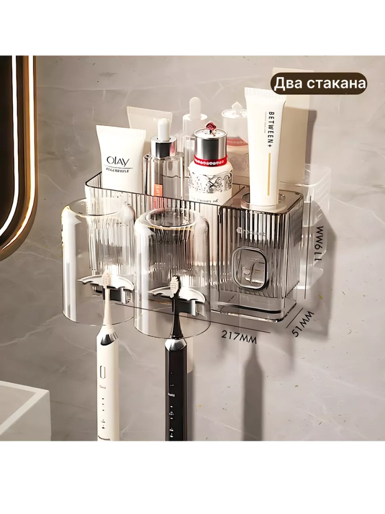 Дозатор для зубной пасты с держателем для зубных щеток. Это удобное и полезное приспособление, которое упростит процесс чистки зубов. Органайзер для ванной прекрасно впишется в любой ванной и сэкономит место. Дозатор для зубной пасты подходит для всех типов пасты с винтовым горлышком. Стильный и компактный дозатор избавит вас от намека на беспорядок в душе или ванной. Настенный или навесной органайзер поможет вам содержать уют, чистоту и порядок в доме. Полочка предназначена для хранения зубных щёток (в том числе детских щёток и электрических щёток). Выдавливатель воздействует прессом на тюбик зубной пасты и помогает быстро без лишних загрязнений добиться ровного слоя на щётке. В комплект с дозатором идут два термостойких стаканчика и держатели для зубных щеток. Сам дозатор крепится при помощи двустороннего скотча. ВАЖНО помнить, что дозатор следует прикреплять на предварительно очищенную и высушенную поверхность, которая должна быть ровной. Перед тем как наклеить дозатор очистите стенки от грязи, пыли и волос, осушите поверхность, затем крепите двусторонний скотч и дозатор. Дайте время дозатору и скотчу сцепиться с поверхностью, НЕ РЕКОМЕНДУЕТСЯ сразу нагружать дозатор. Данный комплект из держателя зубных щёток и стакана является практичным аксессуаром для душевой комнаты.