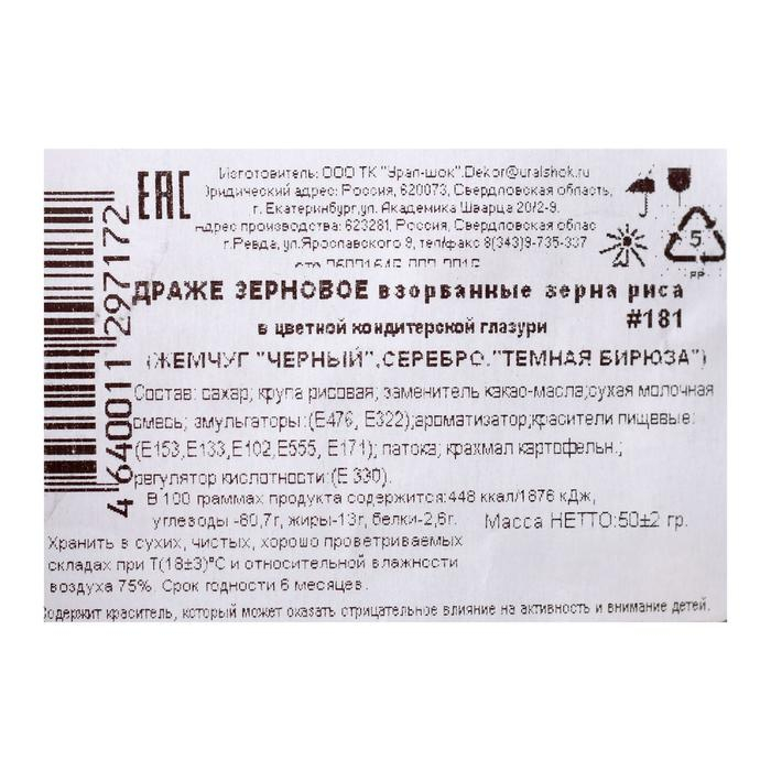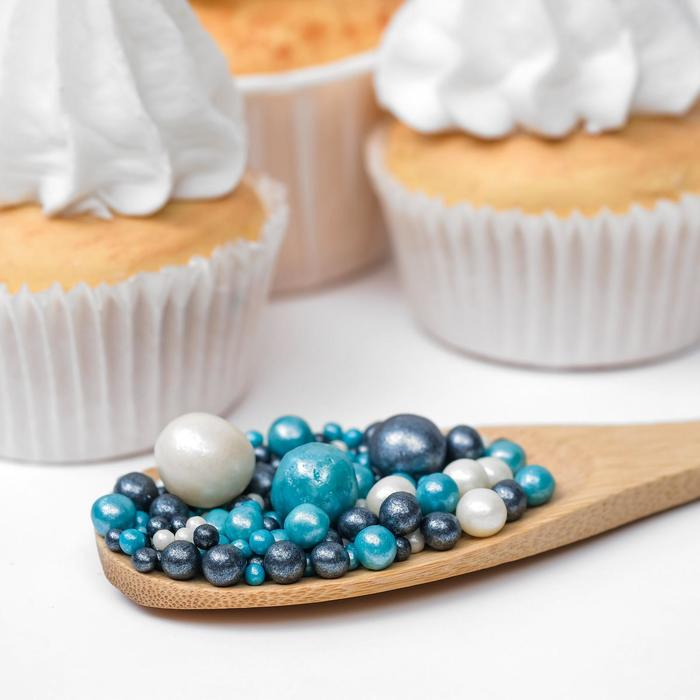 Рисовые шарики в цветной кондитерской глазури. Применяется для непосредственного употребления как готовый продукт к кофе или чаю и при производстве всех типов кондитерских, хлебобулочных изделий (пирожное, торты, кексы, рулеты, мороженое, йогурты), как украшение и добавка в состав изделия. Цвет светло - голубой, чёрный и белый перламутровый. Форма сферическая, диаметр 2 - 13 мм (зависит от диаметра корпуса).