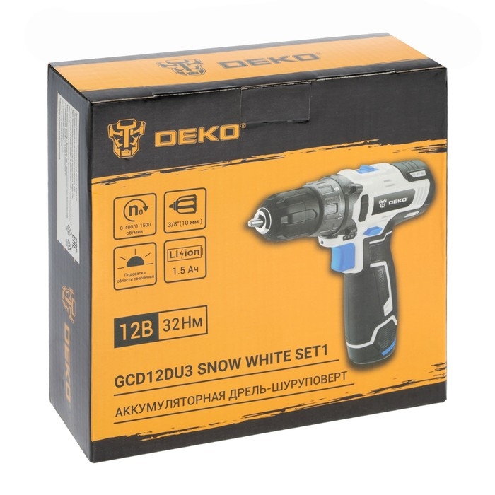 Дрель-шуруповерт DEKO GCD12DU3 SNOW WHITE SET1, 12 В, Li-Ion, 32 Нм, 1.5 Ач, 400/1500 об/мин