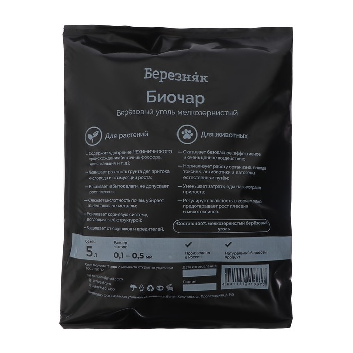 Древесный уголь Биочар "Березняк" - это продукт, который обладает рядом уникальных свойств и способен значительно улучшить качество почвы. Его использование позволяет снизить кислотность почвы, повысить плодородие тяжелых глинистых и бедных песчаных почв, предотвратить образование мха, ускорить прогрев почвы весной, улучшить аэрацию грунта, бороться с вредителями и нормализовать микроклимат.Важным свойством древесного угля "Березняк" является его состав, который включает в себя мелкоизмельченный древесный уголь. Этот продукт отличается высоким содержанием углерода – 93–99%, что делает его эффективным средством для улучшения почвенного плодородия. Биочар "Березняк" не вымывается десятки лет, формируя из бедных свойств чернозем. Он также является надежным магнитом для удержания вносимых удобрений, что позволяет сохранить их эффективность на длительный период времени.Этот продукт является 100% органическим и несет в себе потенциал для использования в качестве кормовой добавки для животных. Таким образом, древесный уголь "Березняк" представляет собой универсальное средство для улучшения почвенного состава и обеспечения высоких урожаев.Рекомендуется вносить древесный уголь "Березняк" с черноземом для достижения максимального эффекта. Его использование способствует созданию благоприятной среды для роста растений, обеспечивая им необходимые питательные вещества и защиту от негативного воздействия окружающей среды.Благодаря своим уникальным свойствам, древесный уголь Биочар "Березняк" является незаменимым инструментом для современного сельского хозяйства и садоводства. Его применение позволяет не только повысить уровень урожайности, но и создать здоровую и устойчивую экосистему, способную эффективно справляться с неблагоприятными внешними факторами.Выводя на рынок древесный уголь "Березняк", мы предлагаем возможность сельскохозяйственным предприятиям и частным фермерам использовать передовые технологии для достижения оптимальных результатов. Наш продукт сочетает в себе высокую эффективность, экологическую безопасность и экономичность, что делает его привлекательным выбором для всех, кто заботится о здоровье почвы и качестве продукции.Древесный уголь Биочар "Березняк" - ваш надежный партнер в создании здоровой и плодородной почвы, обеспечивающей высокие урожаи и устойчивое развитие сельского хозяйства.