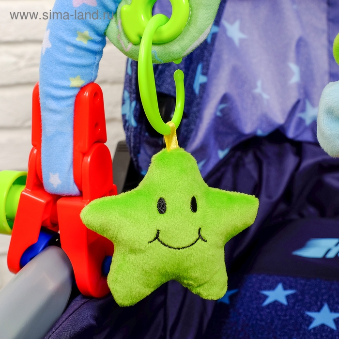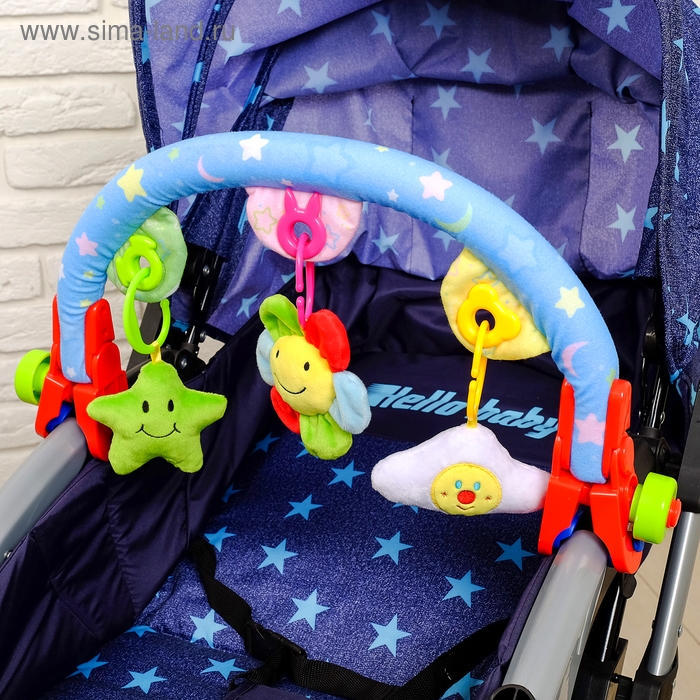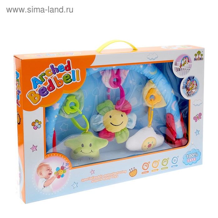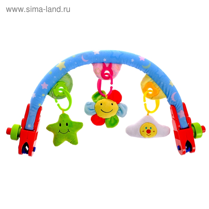 Эту дугу можно закрепить на детской кроватке, коляске или автокресле с помощью удобных прищепок. Угол наклона дуги регулируется. Сначала малыш будет просто рассматривать яркие игрушки, лежа на спинке, но со временем он обязательно начнет тянуться к ним ручками и ножками, совершенствуя свои двигательные навыки. Игрушки на дуге имеют различные цвета и формы, в том числе материал — специально для развития тактильных ощущений малышей. Изделие изготовлено из текстильных материалов с элементами пластмассы.