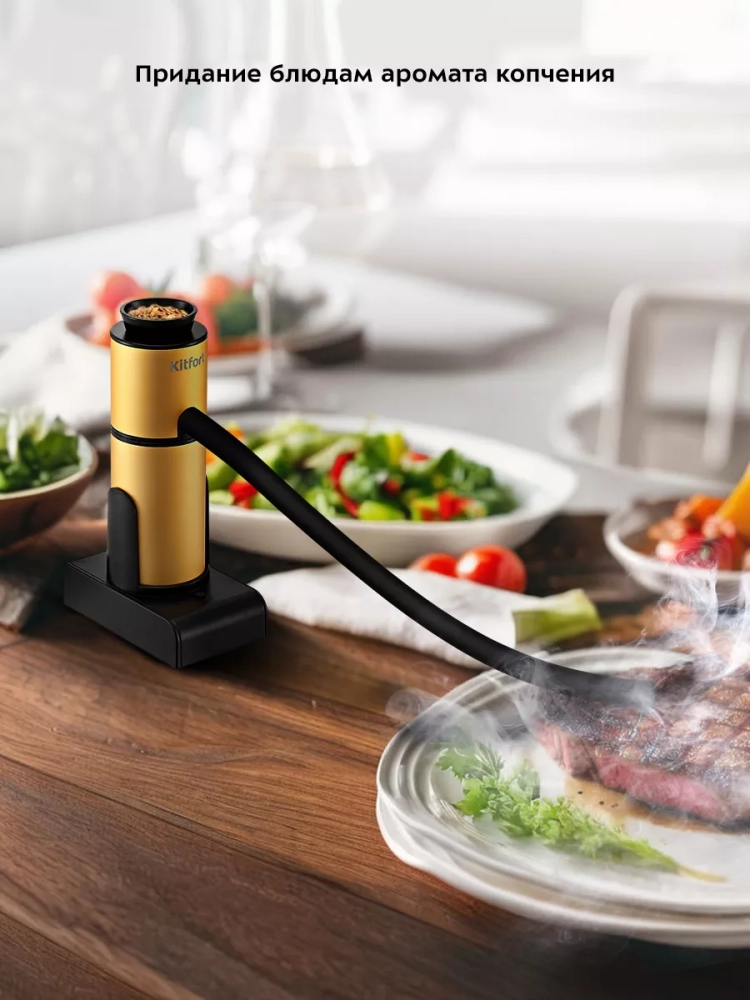 Благодаря широкому основанию дымогенератор устойчиво стоит на столе, а эластичная коптильная трубка позволяет окуривать продукты в любой посуде. Вы можете разместить дымогенератор на столе и окуривать блюдо в тарелке, кастрюле, пакете, стакане, под крышкой клош и даже в блендере при приготовлении коктейлей.