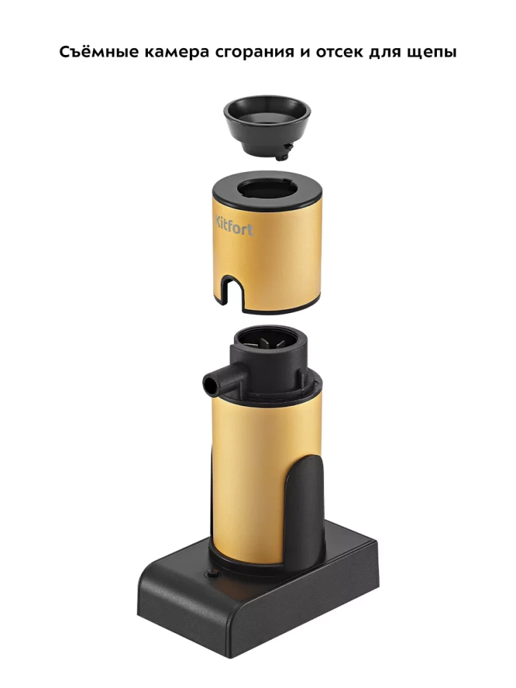 Камера сгорания выполнена из алюминия, эластичная коптильная трубка — из силикона. Камера сгорания и отсек для щепы съемные, что позволяет легко очищать устройство от нагара и осевшей смолы.
