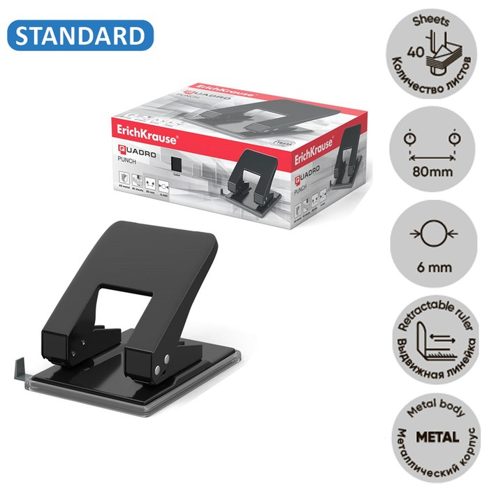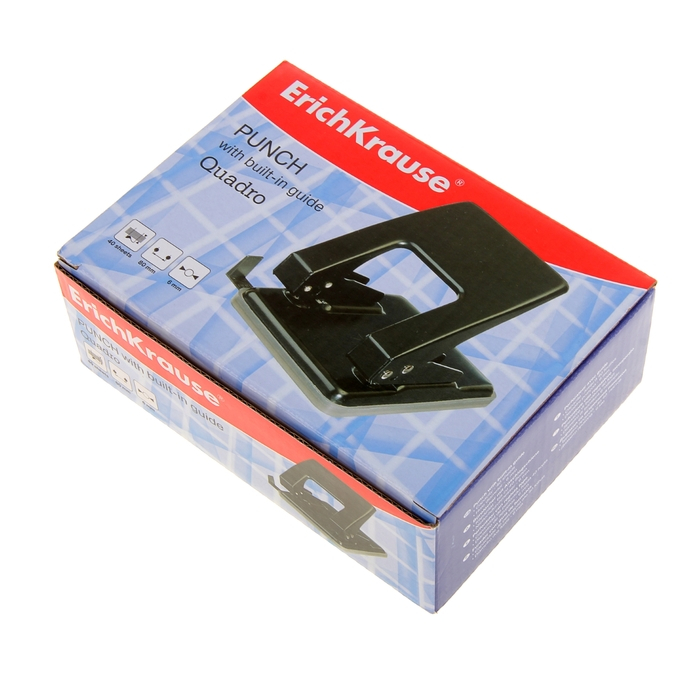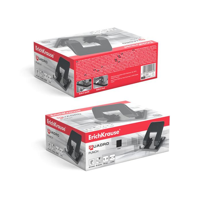 Дырокол до 40 листов ErichKrause Quadro, диаметр прокола 6мм, расстояние между проколами 80мм, микс