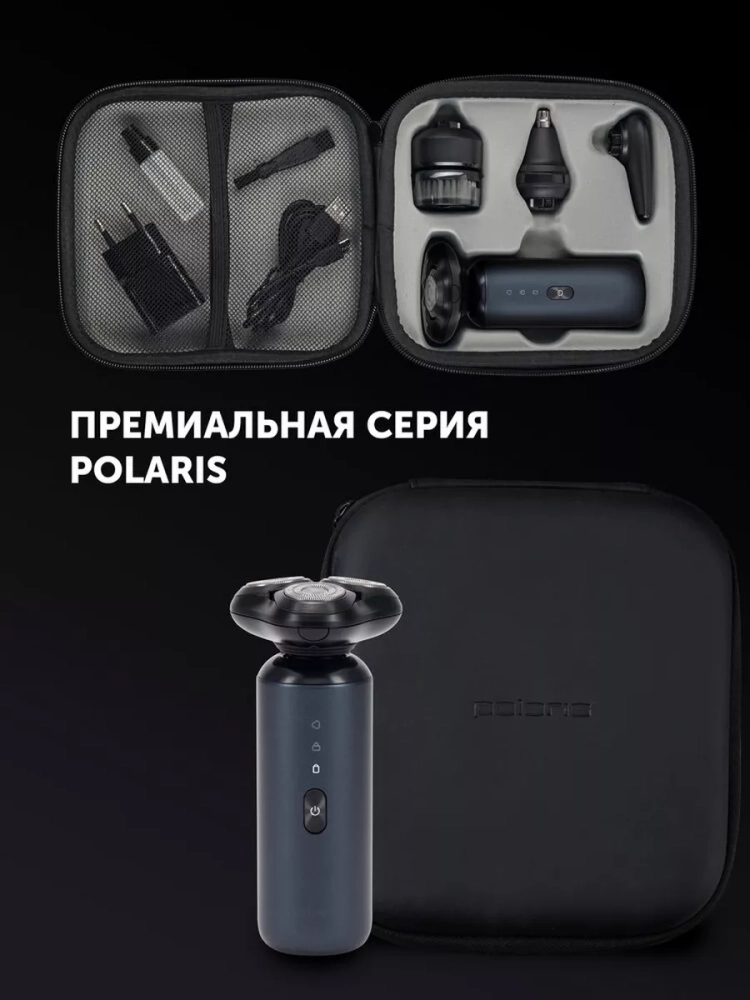 Благодаря влагозащищенному корпусу ухаживать за прибором легко – просто промойте лезвия под струей воды. Удобный чехол позволяет брать мужскую электробритву с аксессуарами с собой в дорогу. Набор для ухода за лицом Polaris станет отличным подарком для мужчин на День рождения, 23 февраля или другой праздник.