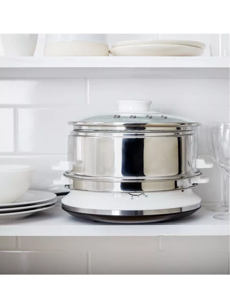 Пароварку с двумя чашами легко хранить, ведь чаши можно перевернуть, сложить одну в другую и установить прямо на основание для компактного хранения. Встроенный таймер автоматически выключит устройство, обеспечивая повышенное удобство использования.