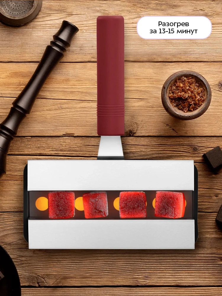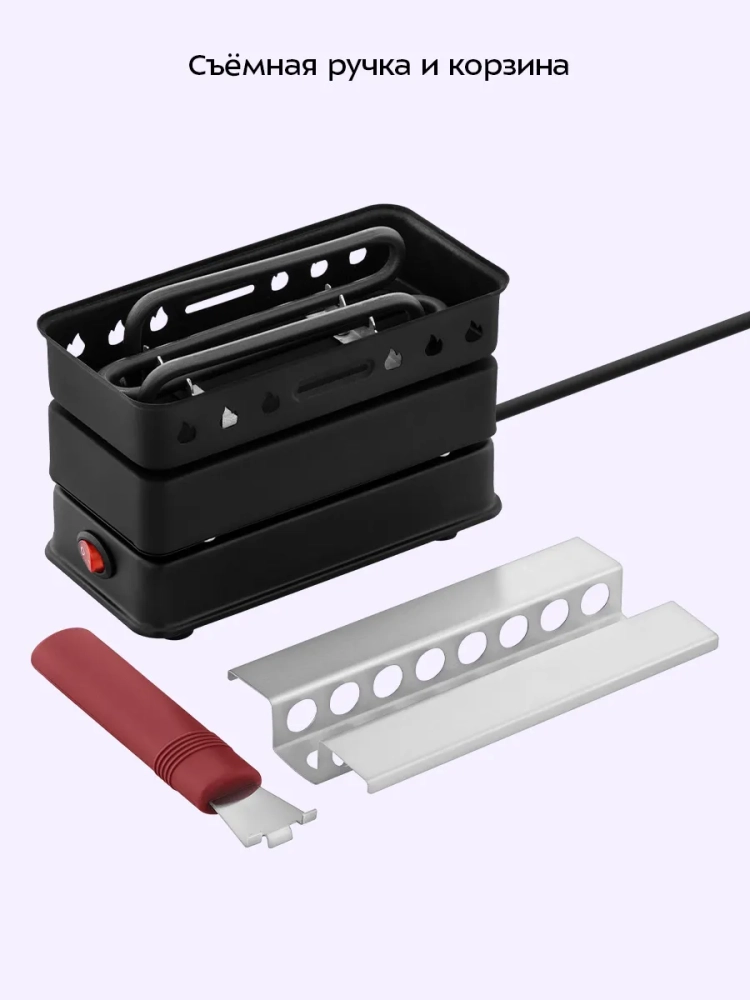 Ручка плиты не нагревается, а для удобства хранения ее можно снять. Ручку можно установить на плиту для розжига углей для кальяна. Корзина для углей съемная.