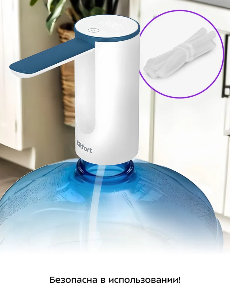 Электрическая помпа для воды Kitfort КТ-6378 предназначена для удобного перелива воды из бутыли в любую другую емкость. Помпа полностью автономная и предназначена для установки на стандартные 19-литровые бутыли. Однако прибор может быть установлен на бутыли с диаметром горлышка 19-59 мм, например, на стандартные бутыли емкостью 5, 10 и 17 л. Но в этом случае помпа не будет плотно прилегать к горлышку емкости.