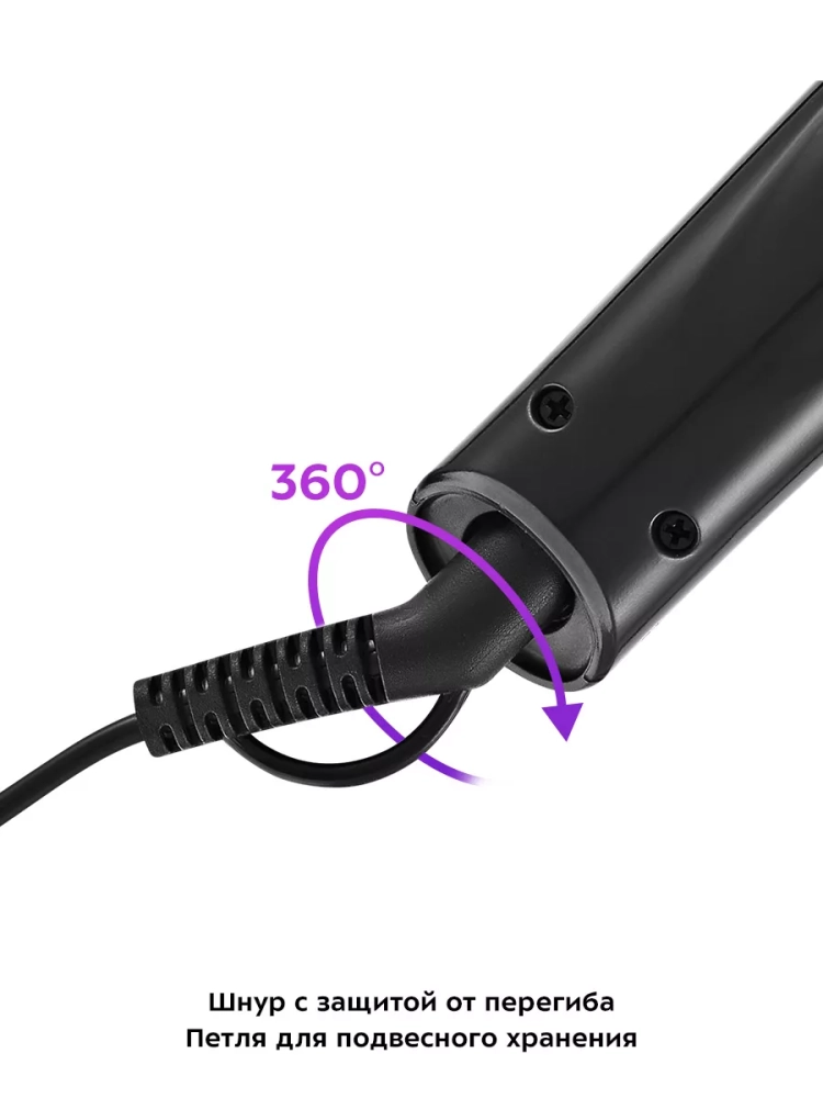 Шнур оснащен защитой от перегиба, что увеличивает срок службы прибора. На защите от перегиба находится петля для подвесного хранения. Вращение шнура на 360° обеспечивает удобство в использовании — провод не скручивается и не путается при повороте устройства.
