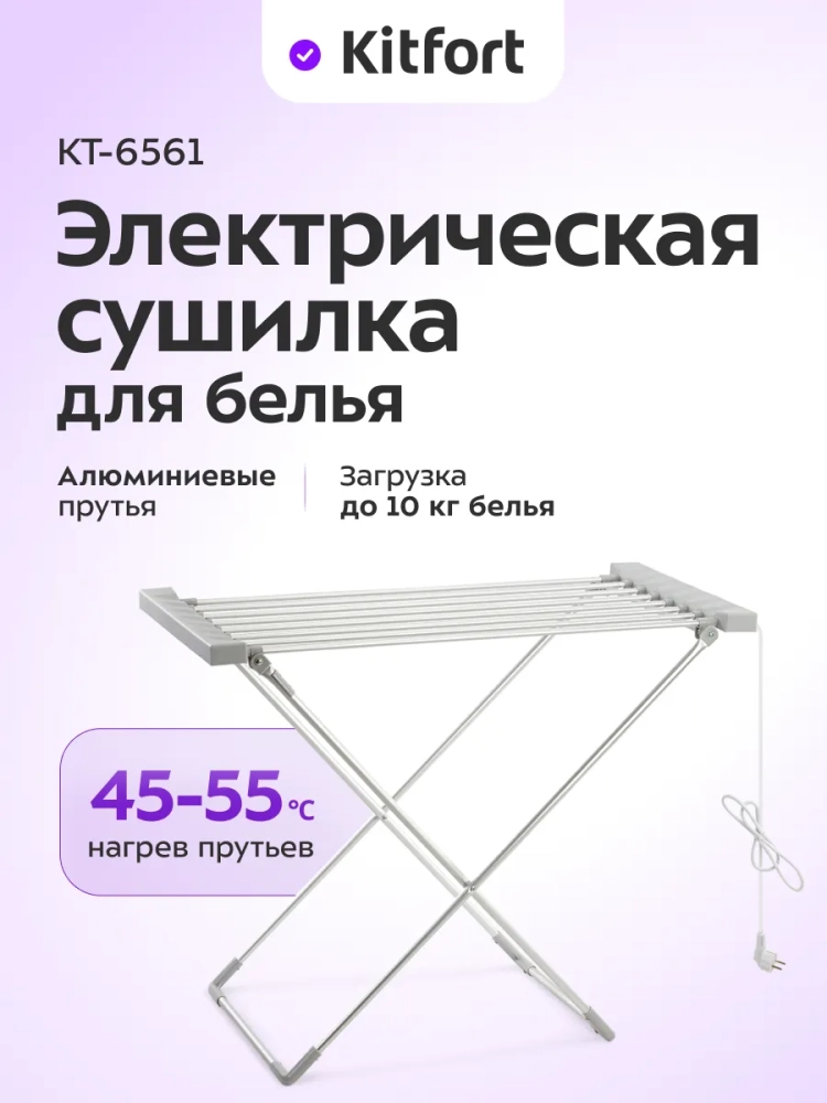 Электрическая сушилка для белья Kitfort KT-6561 быстро сушит вещи после стирки. Особенно полезен данный прибор в зимний период и межсезонье, когда даже с включенным отоплением в доме не так тепло, и белье сохнет намного дольше.