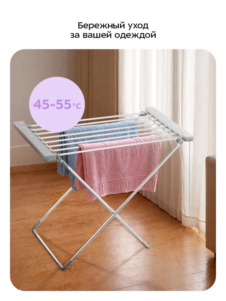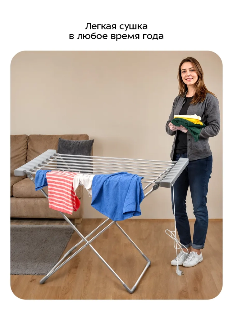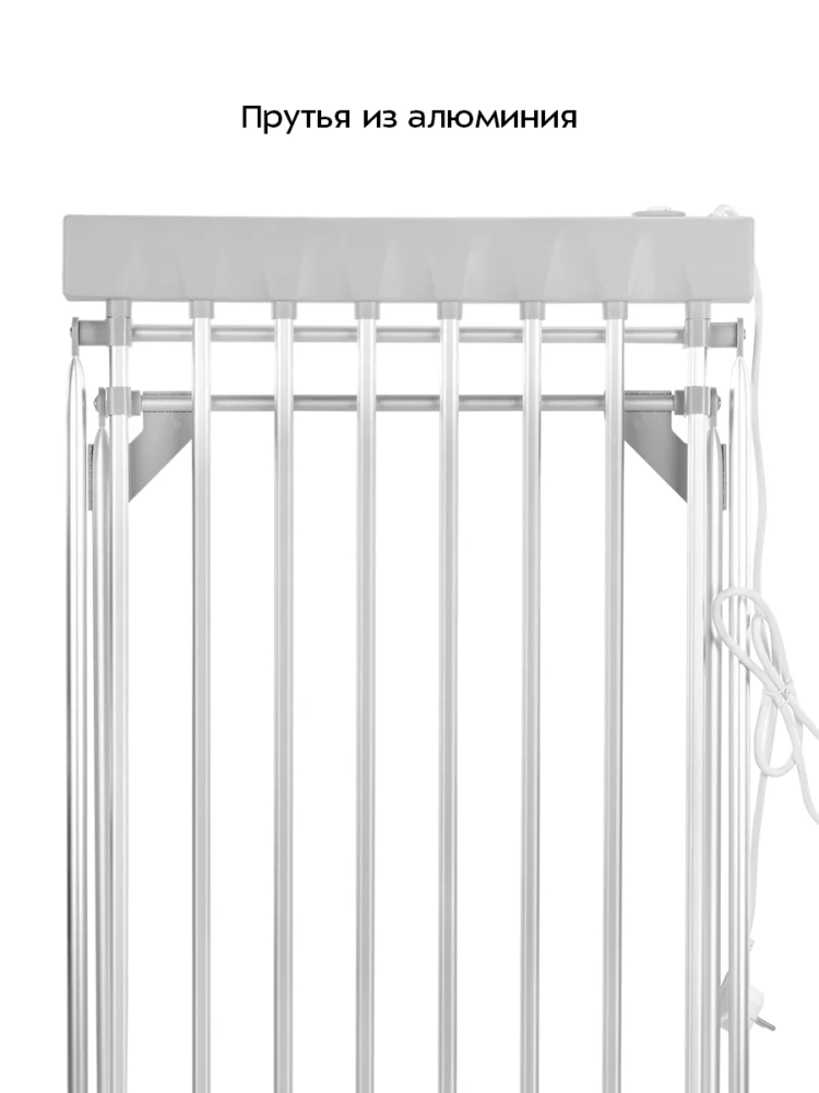 Нагрев прутьев позволяет быстрее высушить вещи по сравнению с неэлектрическими сушилками для белья. Щадящий температурный режим сушки (45–55 °С) сводит к минимуму возможность деформации и повреждения одежды. Прутья из алюминия хорошо проводят тепло и обладают высокой прочностью.