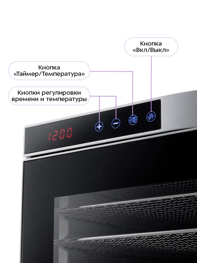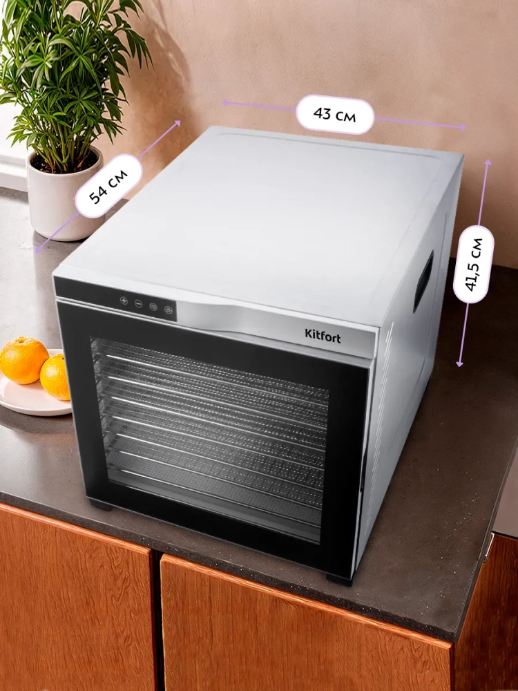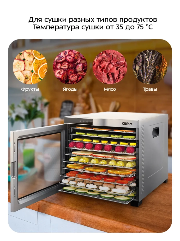 Электрическая сушилка Kitfort КТ-1910 — это идеальное решение для тех, кто хочет сохранить свежесть и вкус своих продуктов. Эта мощная электросушилка предназначена для сушки овощей, фруктов, ягод, грибов, мяса и других продуктов. С помощью этой сушилки вы сможете легко приготовить пастилу благодаря специальному поддону для жидкости. В комплект входят 10 поддонов из нержавеющей стали и 10 сеток для мелких продуктов, что позволяет одновременно обрабатывать большое количество ингредиентов. Сушилка оснащена мощным нагревательным элементом и вентилятором большого диаметра, который обеспечивает равномерное распределение горячего воздуха по всей камере. Это гарантирует качественную сушку без смешения запахов даже при одновременной обработке различных видов продуктов. Температура сушки регулируется в диапазоне от 35 до 75 градусов Цельсия с шагом в 5 градусов, что позволяет точно настроить процесс под каждый тип продукта. Таймер настраивается до 24 часов работы с шагом в полчаса — это удобно для длительной обработки больших партий овощей или фруктов. Дегидратор Kitfort КТ-1910 станет незаменимым помощником на вашей кухне благодаря своей универсальности и простоте использования. Эта овощесушилка подходит не только для домашних условий: она также может использоваться профессионалами в кулинарии или теми, кто занимается заготовками на продажу. Поддон из нержавеющей стали обеспечивает долговечность устройства даже при интенсивной эксплуатации. Сетка помогает эффективно высушивать мелкие продукты без риска их выпадения через крупные отверстия стандартных поддонов. Электросушилка Kitfort КТ-1910 — это надежный дигидратор как для любителей здорового питания, так и профессионалов.