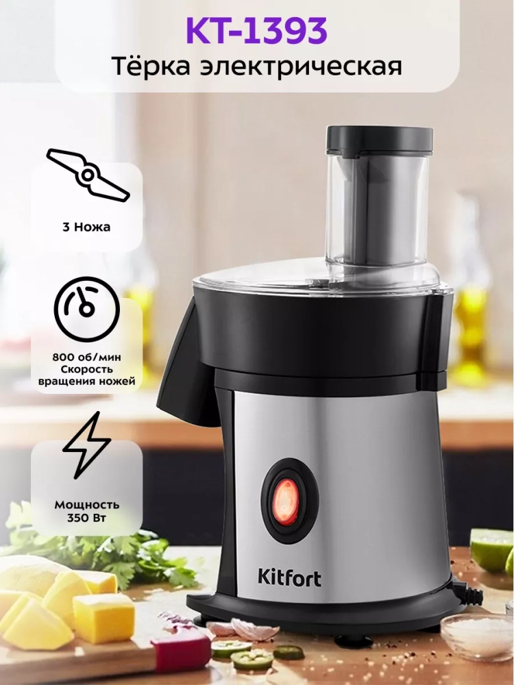 Электрическая терка Kitfort КТ-1393 может выполнять функции шинковки и терки. Для обеспечения безопасности терка может работать только с установленной чашей и крышкой. Резиновые ножки-присоски обеспечивают прочную фиксацию терки на столе. Область применения: терка овощей и сыра, шинковка.