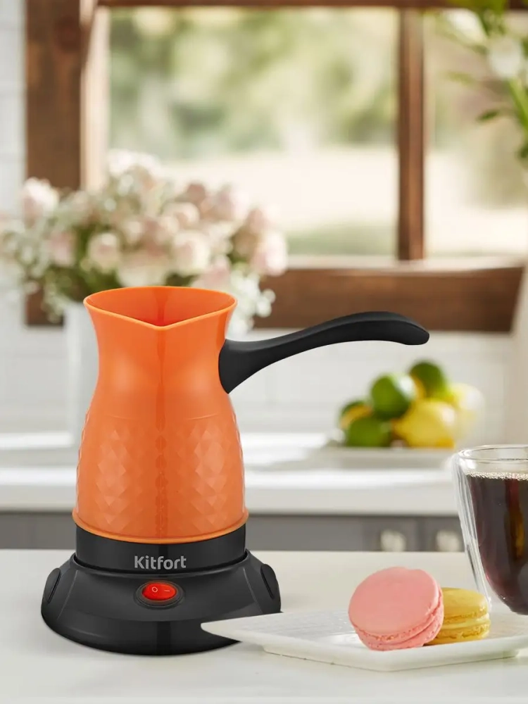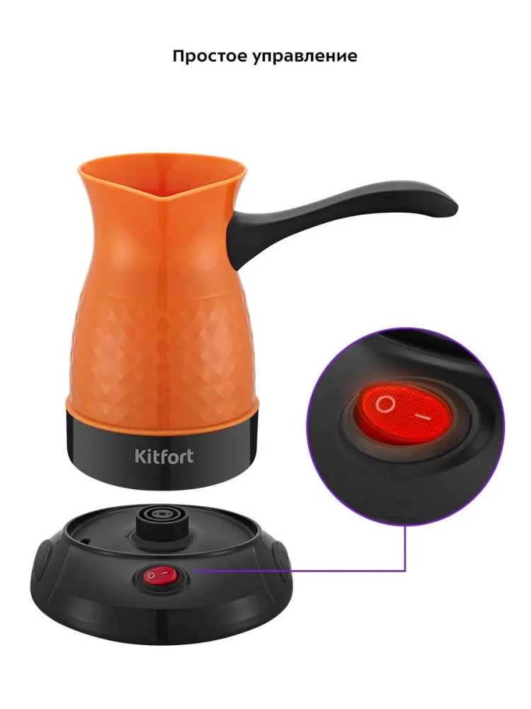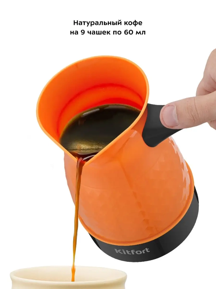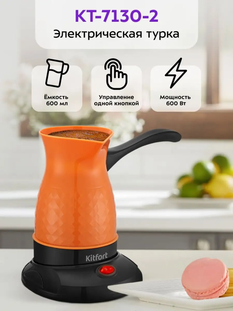 Электрическая турка Kitfort КТ-7130 варит кофе по-турецки. С ней вы сможете быстро и легко сварить натуральный кофе на 8 чашек по 60 мл. Устройство состоит из базы и турки.