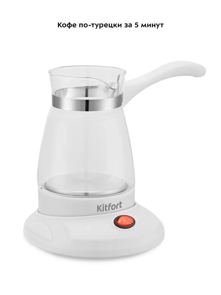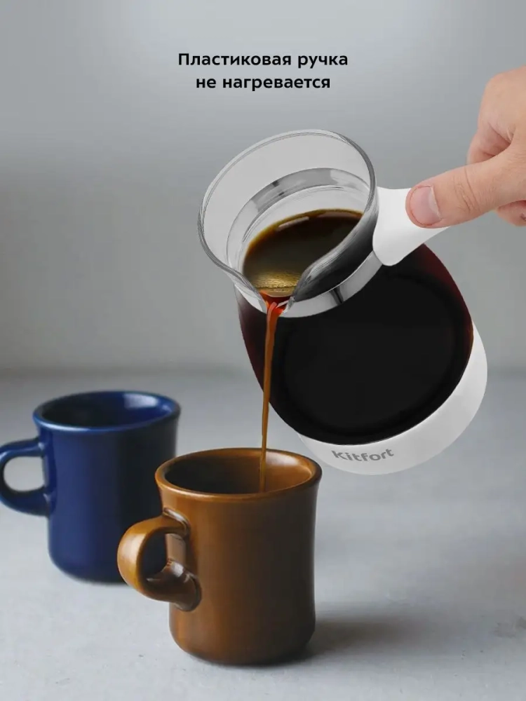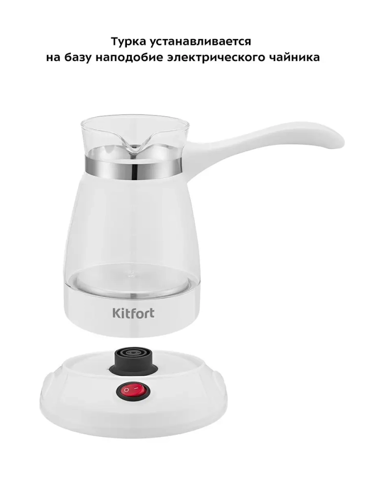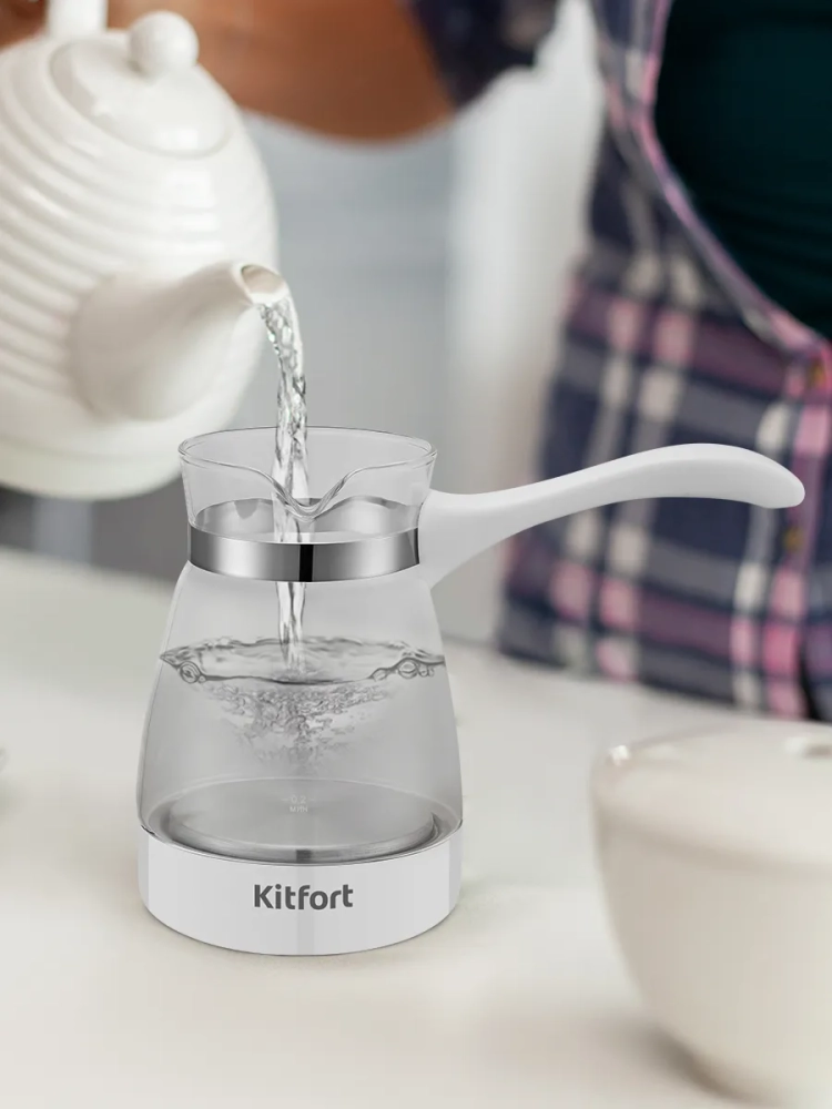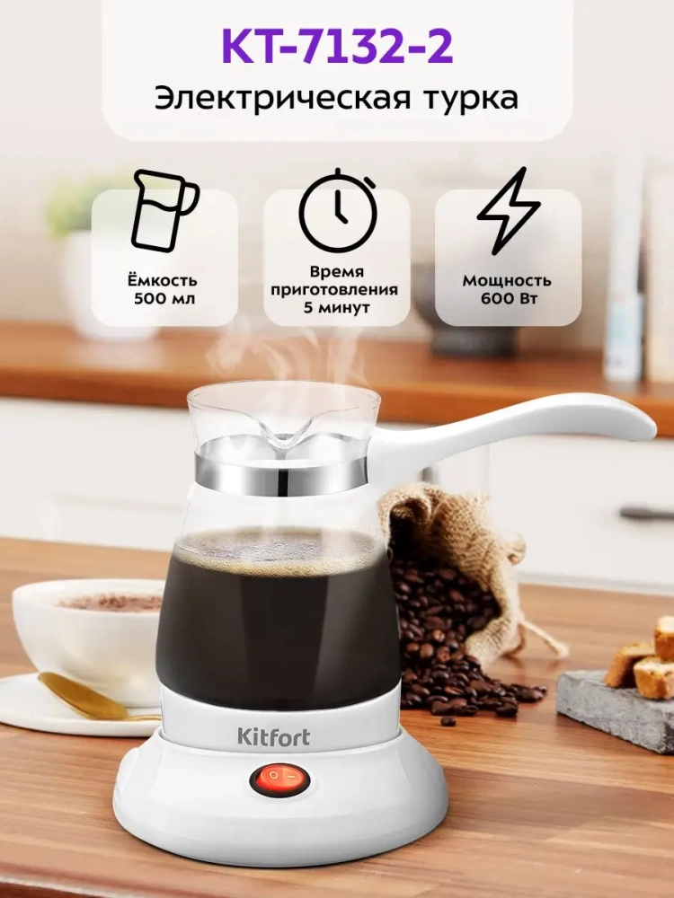 Электрическая турка Kitfort КТ-7132 варит кофе по-турецки. С ней вы сможете быстро и легко сварить натуральный кофе на 7 чашек по 60 мл. Устройство состоит из базы и турки.