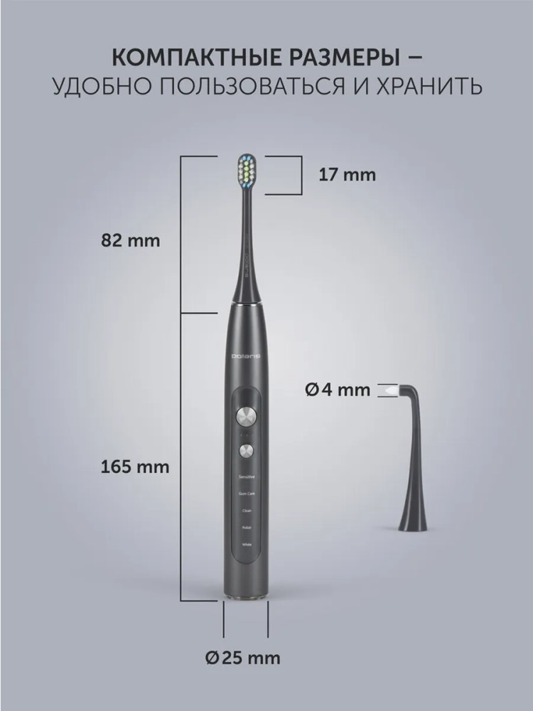 Электрическая зубная щетка Polaris PETB 0220 T предназначена для комплексного ухода за полостью рта. Модель сочетает эффективную технику чистки с бережным воздействием на эмаль и десны. Подходит для ежедневного использования и специального ухода при чувствительных зубах, наличии коронок или брекетов.