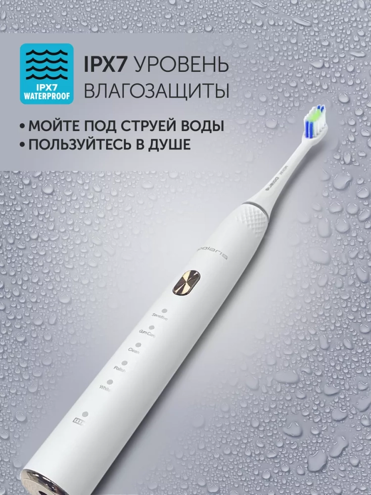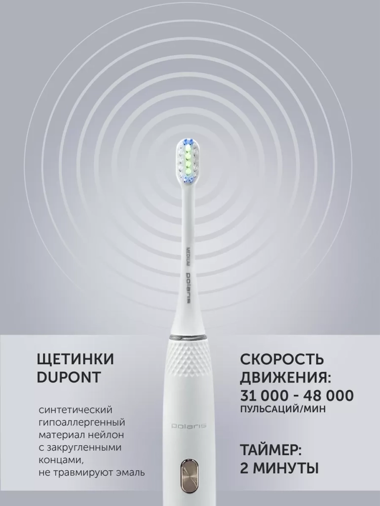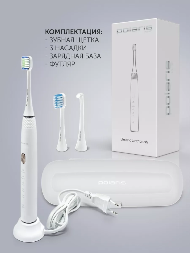 Зубная щетка PETB 0701 TC – это принципиально новый комплексный подход к чистке зубов. 5 режимов электрической звуковой зубной щетки Polaris – это как 5 стоматологических услуг. Они дают возможность получать необходимый профессиональный уход за зубами в домашних условиях на ежедневной основе, включая глубокую чистку на режиме и осветление эмали путем удаления поверхностного налета. В комплекте 3 насадки: насадка с мягкой щетиной, насадка средней жесткости, МОНОПУЧКОВАЯ насадка. Монопучковая насадка дает наилучший результат при чистке межзубных промежутков, десневого края, брекетов, мостов, имплантов. Режим Sensitive рекомендуется для ежедневного применения. На этом режиме литиевая аккумуляторная батарея держит заряд в течение 60 дней. В любом случае о необходимости подзарядить щетку напомнит индикатор заряда на рукоятке щетки.