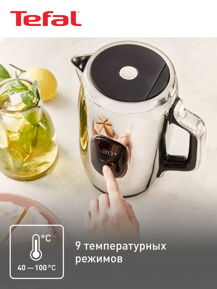 В соответствии с типом напитка или личными предпочтениями вы можете воспользоваться регулировкой температуры и выбрать 1 из 9 температурных режимов, а для исключения риска обжечься при прикосновении чайник из нержавеющей стали имеет двойные стенки. Удобная функция поддержания температуры не позволяет воде остыть в течение 30 минут после нагрева до выбранной температуры.