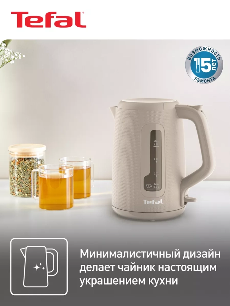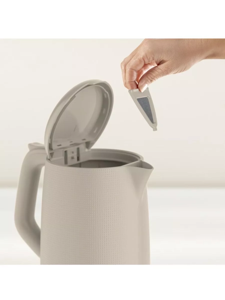 Электрочайник оснащен удобной мерной шкалой со специальной отметкой для одной чашки, что позволяет нагреть нужное количество воды в точности, сколько нужно в текущий момент. Крышка с автоматическим открыванием по нажатию кнопки и широкое горлышко облегчают процесс наполнения и очистки устройства. Кроме того, в носике портативного чайника Тефаль есть съемный фильтр от накипи, который не пропускает частички налета в вашу кружку, тем самым улучшая вкус напитка. При необходимости его можно снять и промыть под проточной водой. А подставка с вращением на 360°, позволит вам ставить и снимать кухонный чайник с любой удобной стороны.