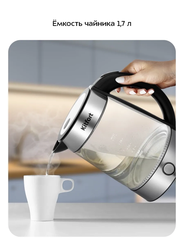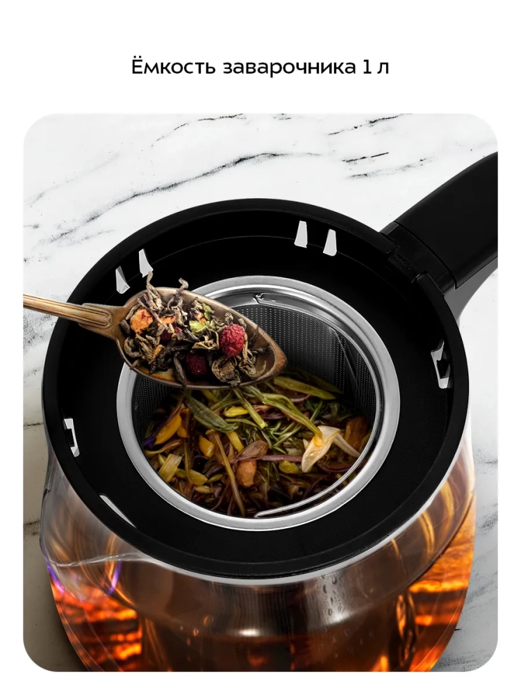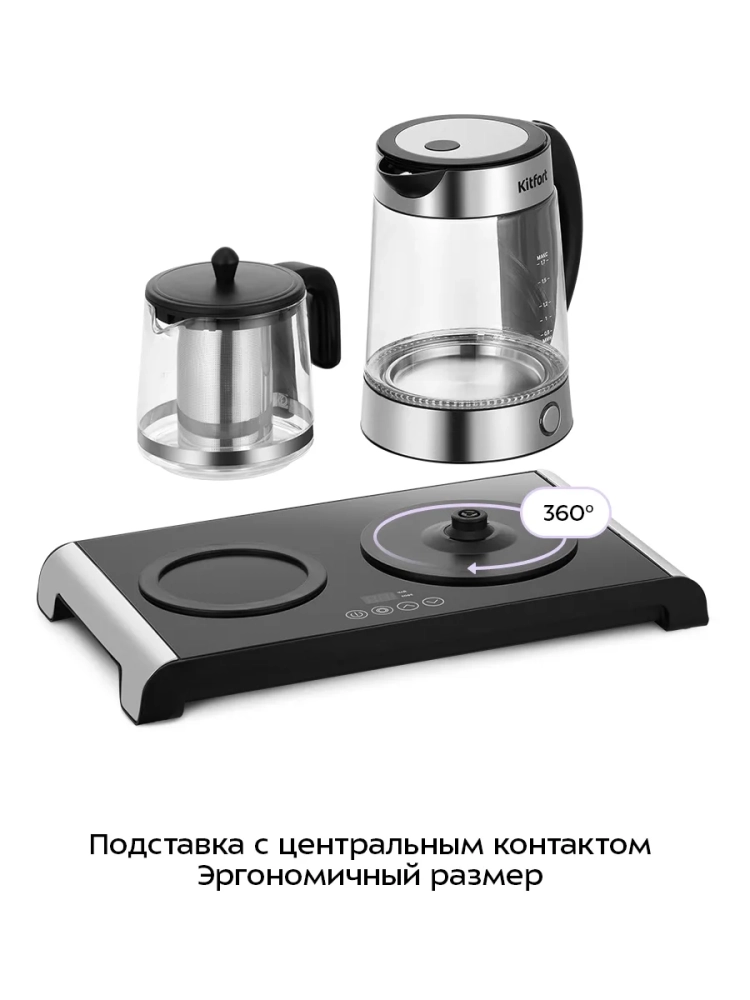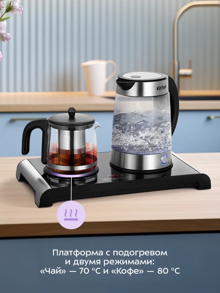 Электрический чайный набор KT-6743 от Kitfort — это превосходное решение для ценителей чая и кофе. В комплект входит электрический чайник объемом 1,7 литра и заварочный чайник на 1 литр с фильтром, а также база с подогревом. Этот стеклянный электрочайник не только вскипятит воду, но и позволит заварить любимый напиток, сохраняя его теплым до четырех часов благодаря встроенной платформе. Модель оснащена двумя режимами работы: "Чай" и "Кофе". На базе расположена панель управления с сенсорными кнопками для выбора режима и установки температурного режима платформы. В режиме "Чай" можно установить температуру от 60 до 80 °С (по умолчанию — 70 °С), а в режиме "Кофе" — от 75 до 85 °С (по умолчанию — 80 °С). Шаг изменения температуры составляет всего один градус Цельсия. База устройства изготовлена из прочной стеклокерамики, устойчивой к царапинам. Материалы корпуса включают стекло, пластик и нержавеющую сталь как у основного чайника, так и у заварочного элемента. Размеры устройства составляют компактные параметры: длина -435 мм; ширина -253 мм; высота -270 мм.