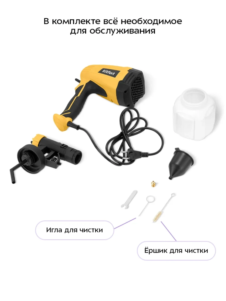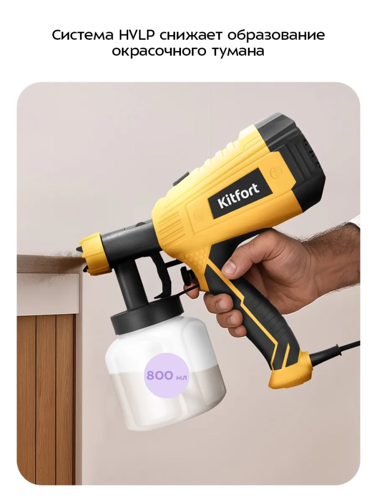 Электрический краскопульт kitfort КТ-6495 предназначен для распыления негорючих материалов, а также для нанесения красок на водной основе, отделочных лакокрасочных материалов, грунтовок, двухкомпонентных красок, лаков, морилок и консервантов для древесины.
