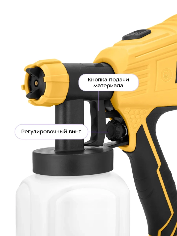 Использование краскопульта по сравнению с валиками или кистями значительно ускоряет ремонтные работы, а также уменьшает расход лакокрасочного материала и позволяет нанести его более ровным слоем. Вы можете контролировать количество подачи материала с помощью регулировочного винта.