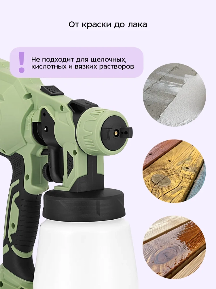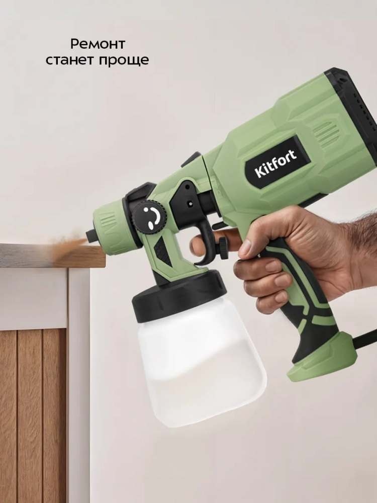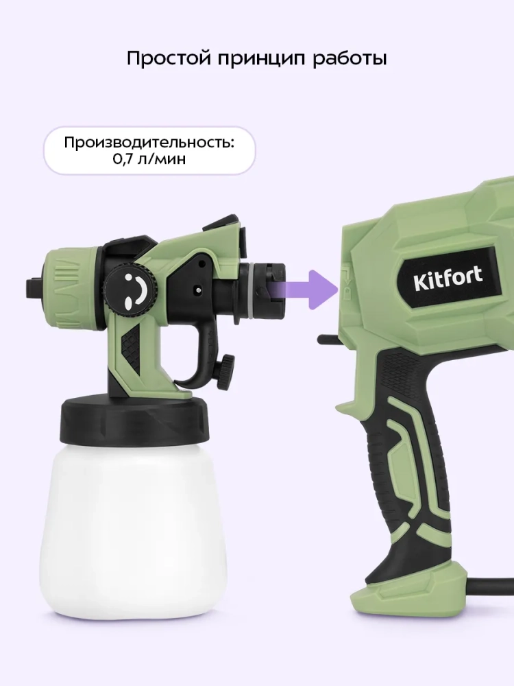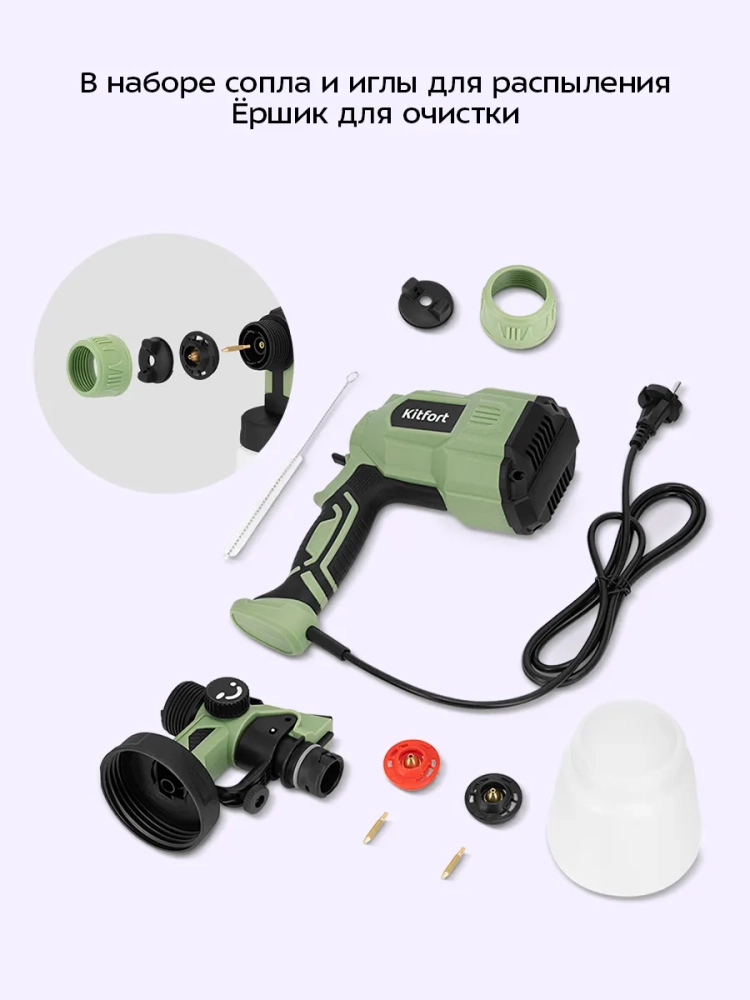 Электрический краскопульт Kitfort КТ-6496 предназначен для распыления негорючих материалов, а также для нанесения красок на водной основе, отделочных лакокрасочных материалов, грунтовок, двухкомпонентных красок, лаков, морилок и консервантов для древесины.