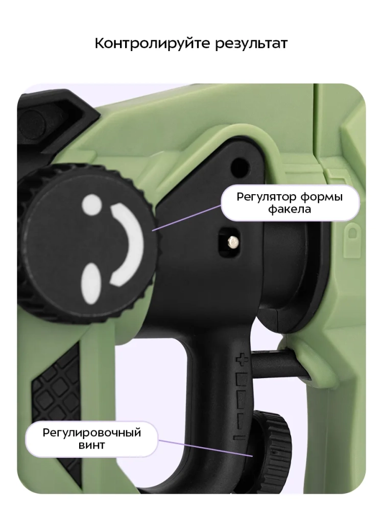 Управление прибором осуществляется нажатием на кнопку подачи материала. Материал из резервуара по всасывающей трубке подается в распылитель. Воздушная головка направляет сжатый воздух к соплу, расщепляет поток материала и формирует облако, или так называемый распылительный факел. Вы можете установить форму факела в виде круга или эллипса (вертикального или горизонтального), меняя положение воздушной головки.