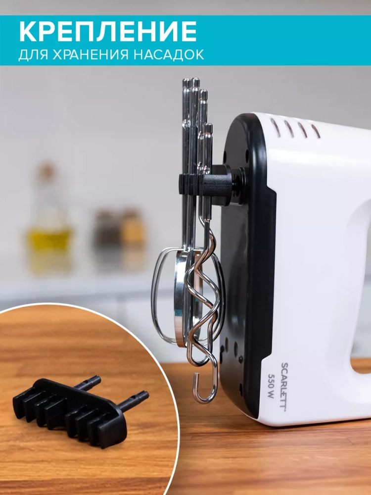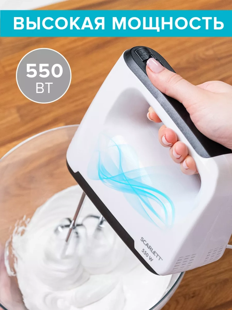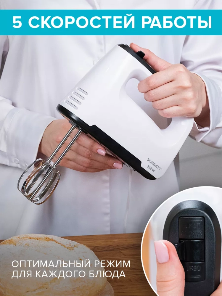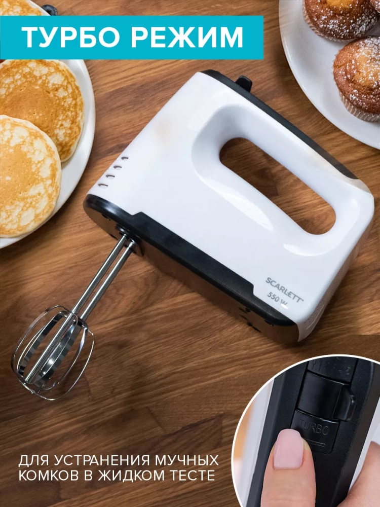 Ручной миксер Scarlett SC-HM40S22 эффективно справится с замешиванием теста или приготовлением крема для торта. Миксер укомплектован 2 венчиками для взбивания сливок и яиц и 2 насадками-крюками для замешивания теста, которые можно хранить непосредственно на приборе, обеспечивая компактное хранение. Корпус миксера выполнен из высококачественного пластика. Переключатель скоростей в диапазоне от 1 до 5 и кнопка отсоединения насадок удобно расположены на ручке прибора. Дополнительный режим Turbo поможет справиться с более сложными задачами.