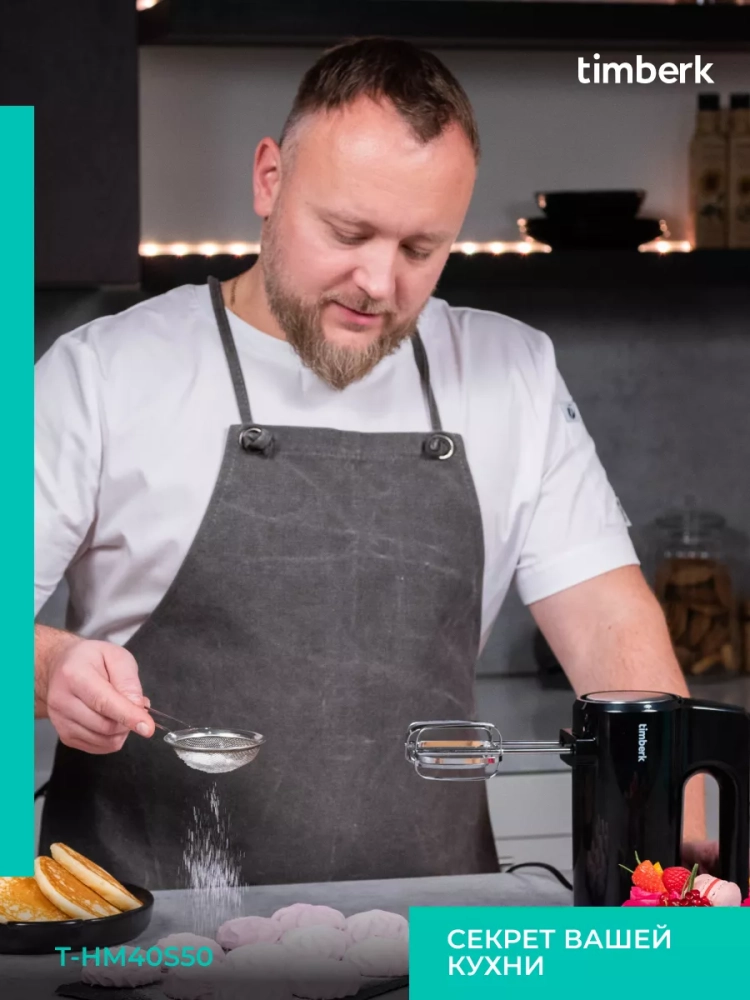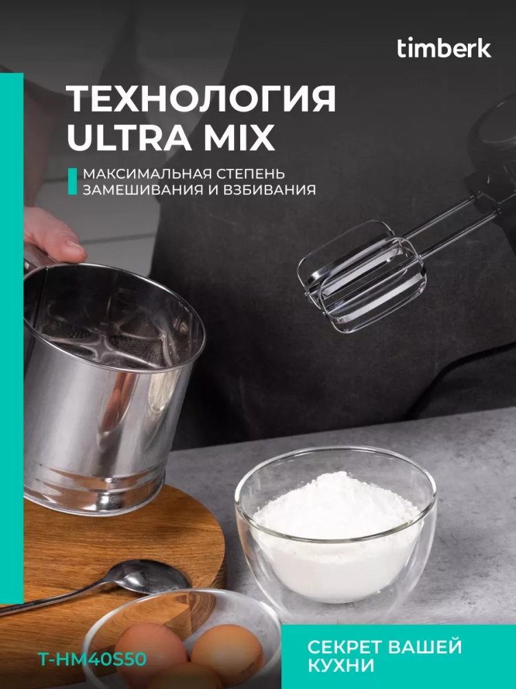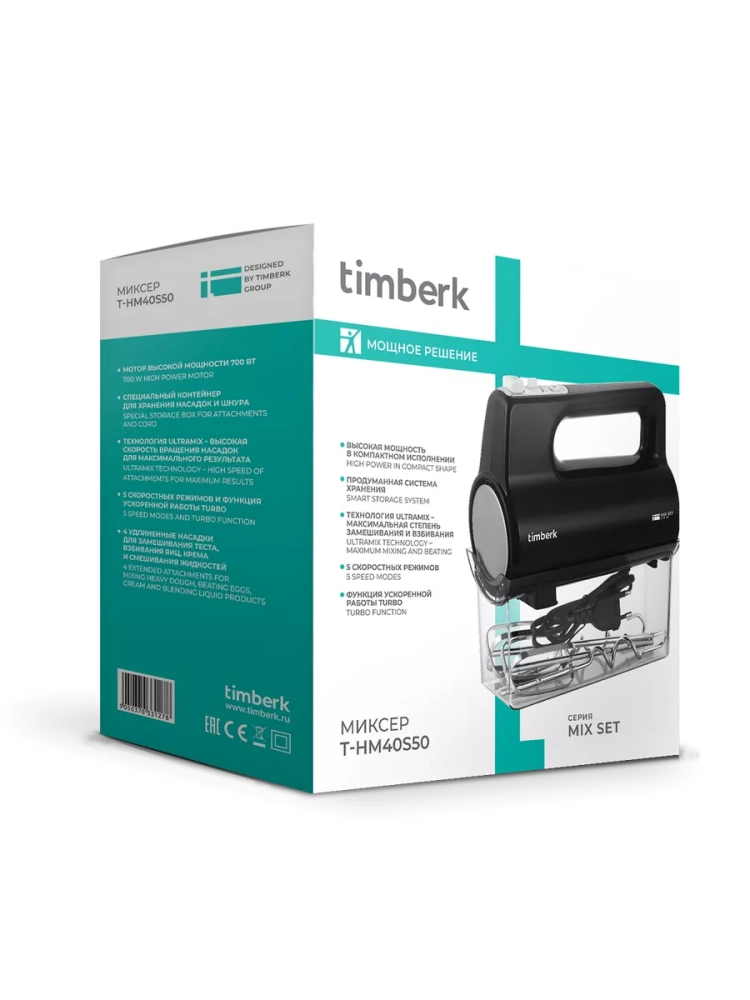 В комплекте предусмотрены 2 крюка для замешивания теста и 2 венчика для взбивания яиц и крема, смешивания жидкостей. Значимым преимуществом модели является увеличенная длина насадок длиной 18 см, способствующая переработке продуктов даже в глубокой посуде. Для компактного хранения насадок и шнура в комплекте предусмотрен специальный контейнер.