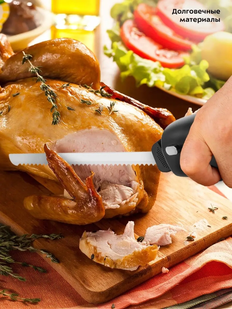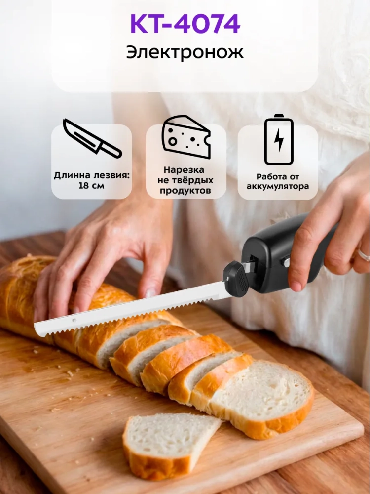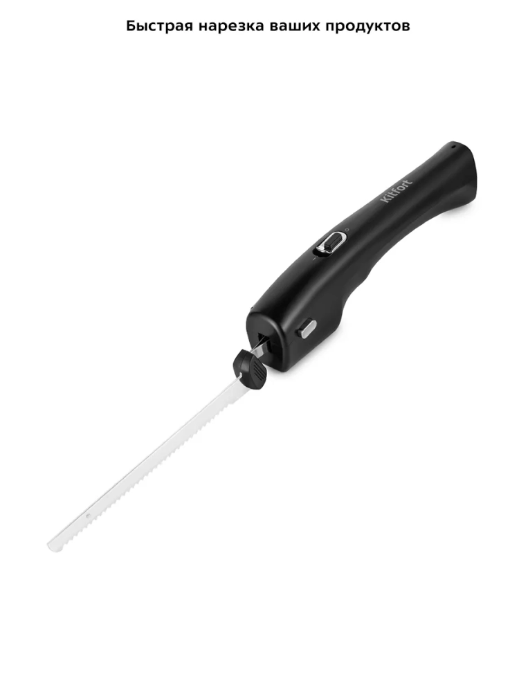 Беспроводной электронож Kitfort КТ-4074 — устройство, которое поможет вам быстро и легко нарезать продукты. Электронож используется для нарезки мягких и не очень твердых продуктов: хлеба и другой выпечки, колбас, сыров, огурцов, баклажанов и т. п. Данная модель не предназначена для разделывания костей, хрящей и других твердых продуктов.