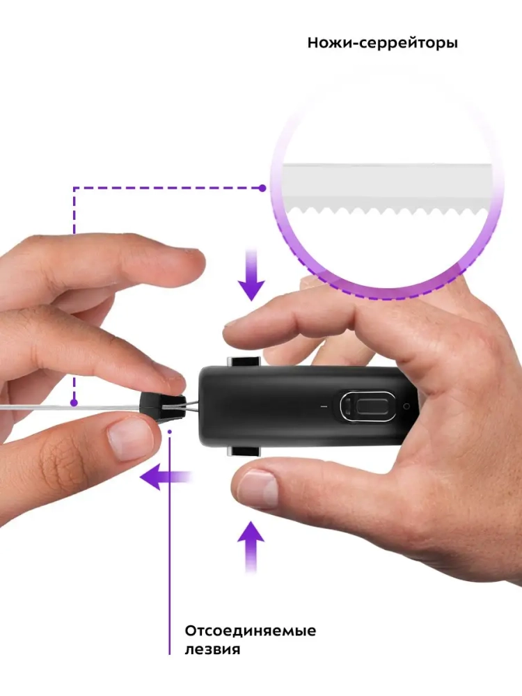 Модель КТ-4074 оснащена кнопками снятия ножей для их легкого и безопасного извлечения из корпуса. В данной модели предусмотрен переключатель безопасности. Чтобы включить нож, необходимо передвинуть вверх переключатель, тогда можно будет нажать на кнопку включения.