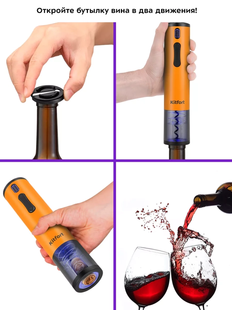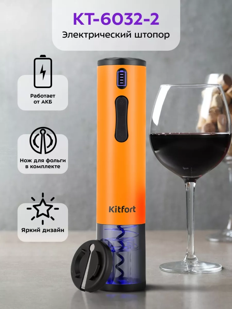 Электрический штопор Kitfort KT-6032 поможет легко, быстро и безопасно открыть бутылку вина. Процесс открывания бутылки станет простым и займет всего несколько секунд. Также вам больше не придется прикладывать дополнительные усилия, как это часто бывает при использовании обычного штопора. Электрический штопор предотвращает риск пролить вино или пораниться. С электрическим штопором вы можете эффектно открыть вино для подачи к столу и удивить гостей.