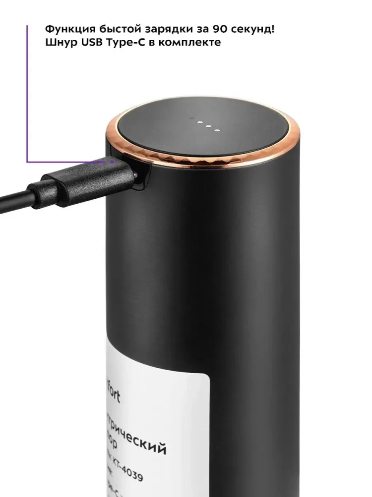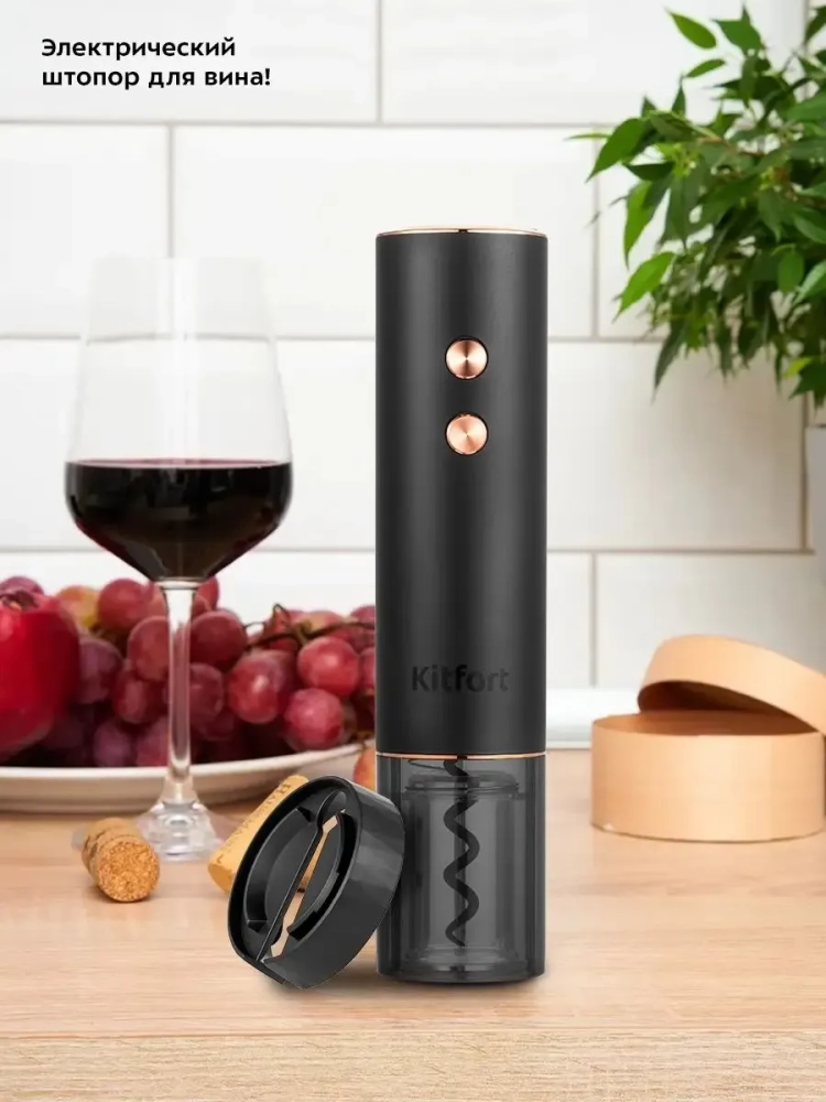 Электрический штопор Kitfort KT-4039 поможет легко, быстро и безопасно открыть бутылку вина. Процесс открывания бутылки станет простым и займет всего несколько секунд. Также вам больше не придется прикладывать дополнительные усилия, как это часто бывает при использовании обычного штопора. Электрический штопор предотвращает риск пролить вино или пораниться. С электрическим штопором вы можете эффектно открыть вино для подачи к столу и удивить гостей. Корпус устройства выполнен из металла и пластика, а спираль полностью скрыта корпусом. Чтобы наблюдать за процессом, нижняя часть корпуса прозрачная. В комплекте есть специальный нож для фольги, который крепится к нижней части штопора для хранения. Пользоваться электрическим штопором очень просто, так как у него всего две кнопки: при нажатии на нижнюю кнопку штопор открывает пробку, а при нажатии на верхнюю кнопку включается движение в обратном направлении, чтобы удалить пробку из штопора. Во время работы штопора включается подсветка. Устройство питается от встроенного аккумулятора. На верхней части корпуса есть индикатор заряда. У штопора KT-4039 есть функция быстрой зарядки: если аккумулятор сел, а вам необходимо открыть пару бутылок вина, вы можете подзарядить штопор в течение 90 секунд. Этого хватит, чтобы открыть до 4 бутылок вина. Благодаря строгому, минималистичному дизайну и небольшим размерам электрический штопор легко впишется в ваш интерьер.