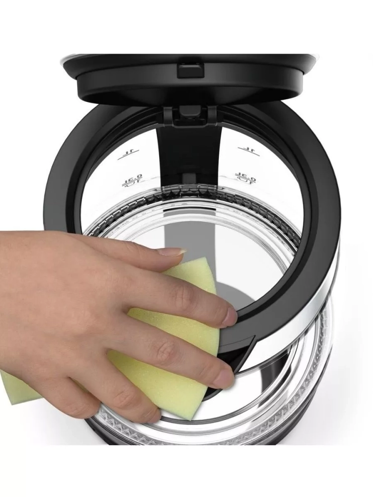 Техника для кухни выполнена из кристально чистого и прозрачного термостойкого стекла, которое сохраняет естественный вкус воды для вашего чая, кофе и других напитков. Через прозрачные стенки вы можете следить за уровнем воды и наблюдать за процессом кипячения, который завораживает благодаря встроенной подсветке. Также портативный чайник вмещает в себя большой объем жидкости до 1,7 л, что идеально подойдет для приятных моментов, которые можно разделить в компании семьи и друзей.