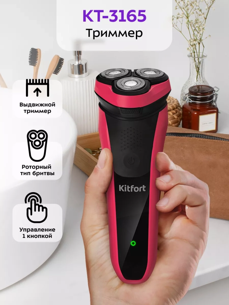 Роторная электробритва Kitfort KT-3165 — это прибор для бритья, а также для подравнивания усов или бороды. Тип данной бритвы — роторный. У таких бритв во время работы лезвия, которые закрыты металлическими сетками, синхронно вращаются. Волоски, попадая в перфорацию сеток, срезаются вращающимися лезвиями. Роторные бритвы отлично справляются с жесткой щетиной, а также с более длинными волосами, которые растут в разном направлении.