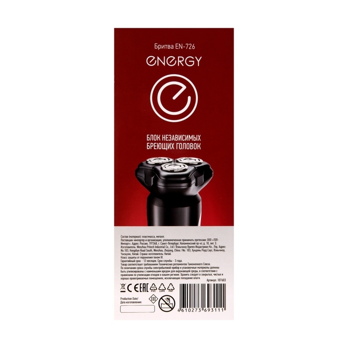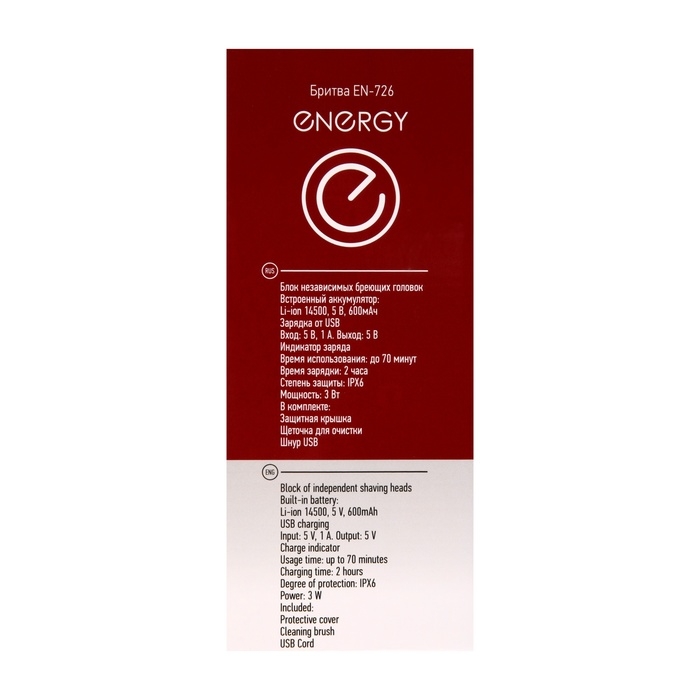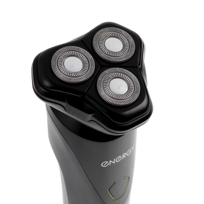 Электробритва Energy EN-726, 3 Вт, роторная, 3 головки, влажное бритьё, от АКБ, чёрная