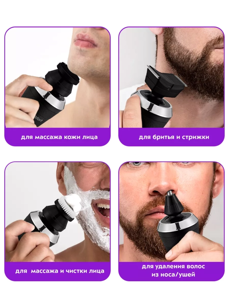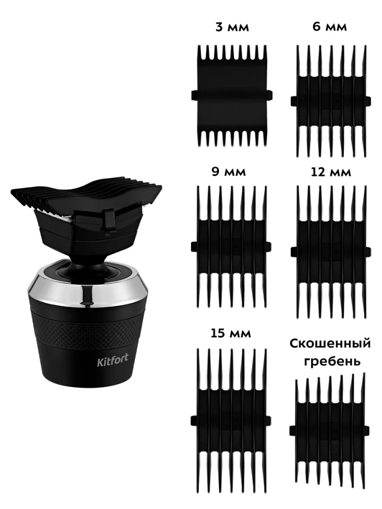 У бритвы Китфорт КТ-3142 в комплект идут гребни, которые рассчитаны на стрижку коротких волос. Также в комплекте есть насадка для носа, которой также можно удалять волосы из ушей, насадка-триммер для бритья и подравнивания волос на лице и насадки для массажа лица.