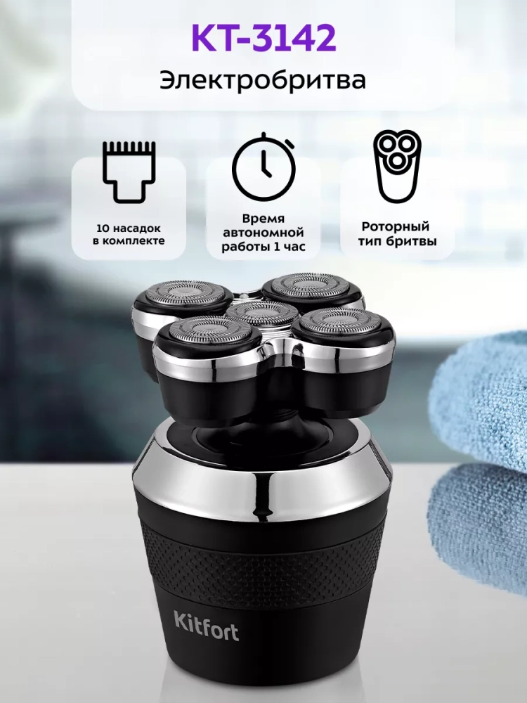 Электробритва Kitfort KT-3142 — это прибор для бритья, а также для подравнивания усов или бороды. У данной бритвы основная насадка роторная. У таких бритв во время работы, лезвия, которые закрыты металлическими сетками, синхронно вращаются. Волоски, попадая в перфорацию сеток, срезаются вращающимися лезвиями. Роторные бритвы отлично справляются с жесткой щетиной, а также с более длинными волосами, которые растут в разном направлении. Роторная насадка съемная.