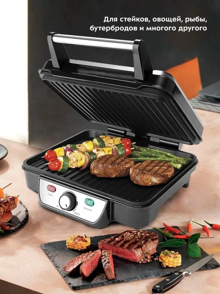 Электрогриль Kitfort КТ-1626 — это многофункциональный электрический бытовой прибор, который станет незаменимым помощником на вашей кухне. Этот мини электрический гриль позволяет готовить разнообразные блюда: от сочных стейков и овощей до рыбы и бутербродов. Благодаря ребристой поверхности рабочих пластин, излишки жира эффективно удаляются из продуктов во время приготовления. Идеальный подарок на любой случай: на Новый год, 23 февраля, 8 марта, день рождения, свадьбу или юбилей! Конструкция "2 в 1" делает этот гриль особенно удобным в использовании. В двухстороннем режиме крышка закрывается, обеспечивая равномерное приготовление с обеих сторон. В одностороннем режиме крышка откидывается на 180 градусов, превращая устройство в большую жаровню для барбекю или других блюд. Электрогриль оснащен термостатом с плавной регулировкой температуры, что позволяет точно контролировать процесс работы. Индикатор нагрева сигнализирует о достижении нужной температуры для начала готовки. Нагревательные панели изготовлены из алюминия с антипригарным покрытием, что облегчает уход за устройством и предотвращает пригорание продуктов. Специальные бороздки на панелях способствуют сбору вытапливаемого жира, который затем стекает в поддон для сбора жира. Этот электрический гриль идеально подходит как для повседневного использования дома, так и для организации пикников или барбекю на свежем воздухе благодаря своей мобильности и простоте эксплуатации.