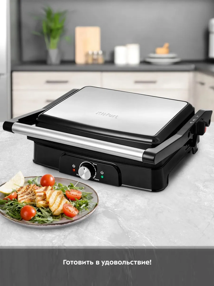 Электрогриль Kitfort КТ-1655 — это идеальное многофункциональное решение для любителей вкусной и быстрой еды. Этот электрический гриль предназначен для приготовления разнообразных блюд, таких как мясо, рыба, овощи, сосиски и бутерброды, panini. Благодаря высокой температуре и ребристой поверхности панели продукты приобретают аппетитный полосатый рисунок. Электрогриль оснащен тремя режимами работы: двусторонним, односторонним и с приоткрытой крышкой. В двустороннем режиме продукты готовятся между двумя нагреваемыми панелями одновременно с обеих сторон. Односторонний режим позволяет использовать кухонный гриль как большую жаровню благодаря откидыванию крышки на 180°, что дает возможность выкладывать продукты сразу на две панели. Антипригарное покрытие алюминиевых панелей обеспечивает легкость в уходе за устройством после использования. Электрогриль оборудован термостатом для поддержания постоянной температуры панелей и индикаторами включения устройства в сеть и нагрева панелей. Специальные бороздки на нижней и верхней панелях собирают жир, соки и лишний маринад во время приготовления пищи. Этот бытовой электрический прибор идеально подходит для домашнего использования или барбекю на открытом воздухе благодаря своей универсальности и простоте эксплуатации. Готовьте любимые блюда быстро с помощью электрического гриля Kitfort! Панель управления интуитивно понятна даже новичкам в кулинарии.