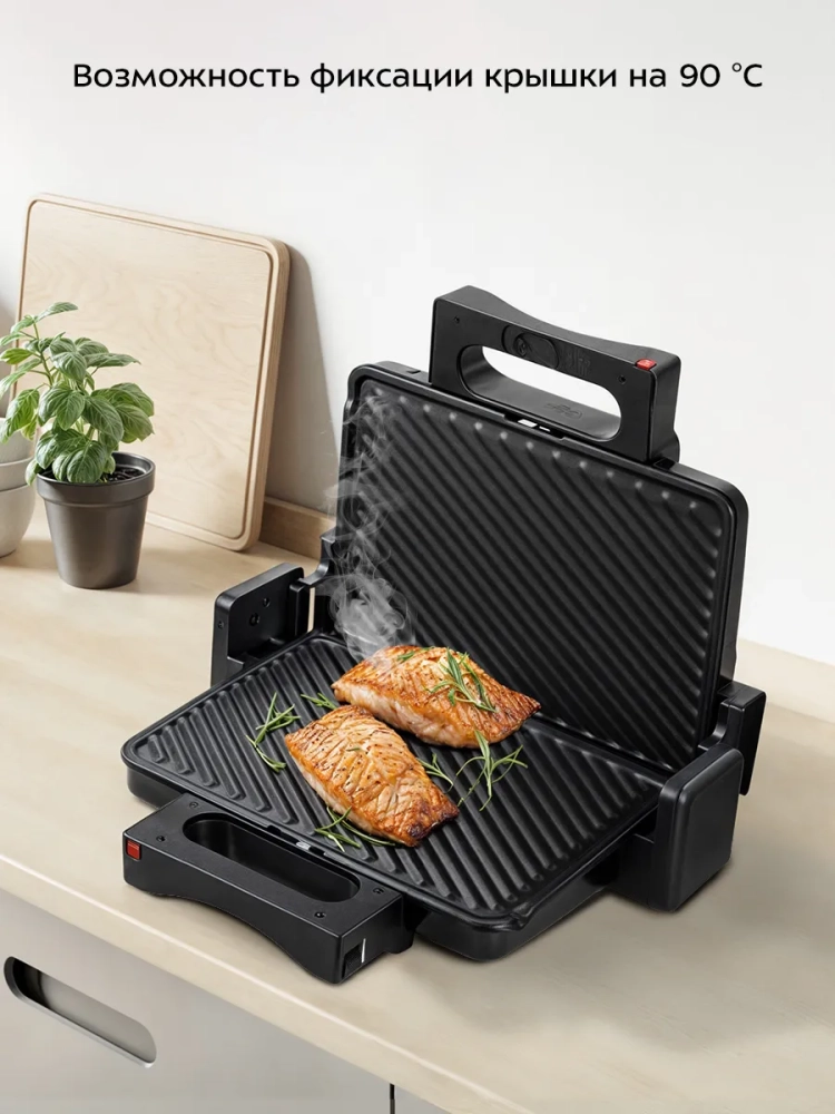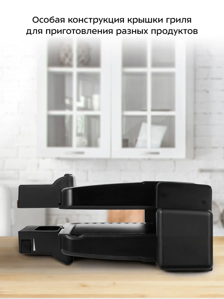 Также из-за особой конструкции крышку гриля можно поднять так, что она будет находиться на расстоянии от нижней панели. Это удобно для приготовления объемных или хрупких продуктов.