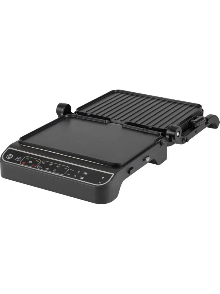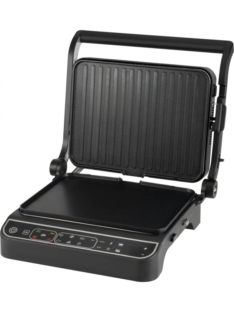 Принадлежности в комплекте: термо щуп, лоток для жира. Раздельное включение нагревательных элементов. Информационный дисплей. Фиксация в закрытом состоянии. Ненагревающаяся ручка. Раскрытие на 180 градусов.