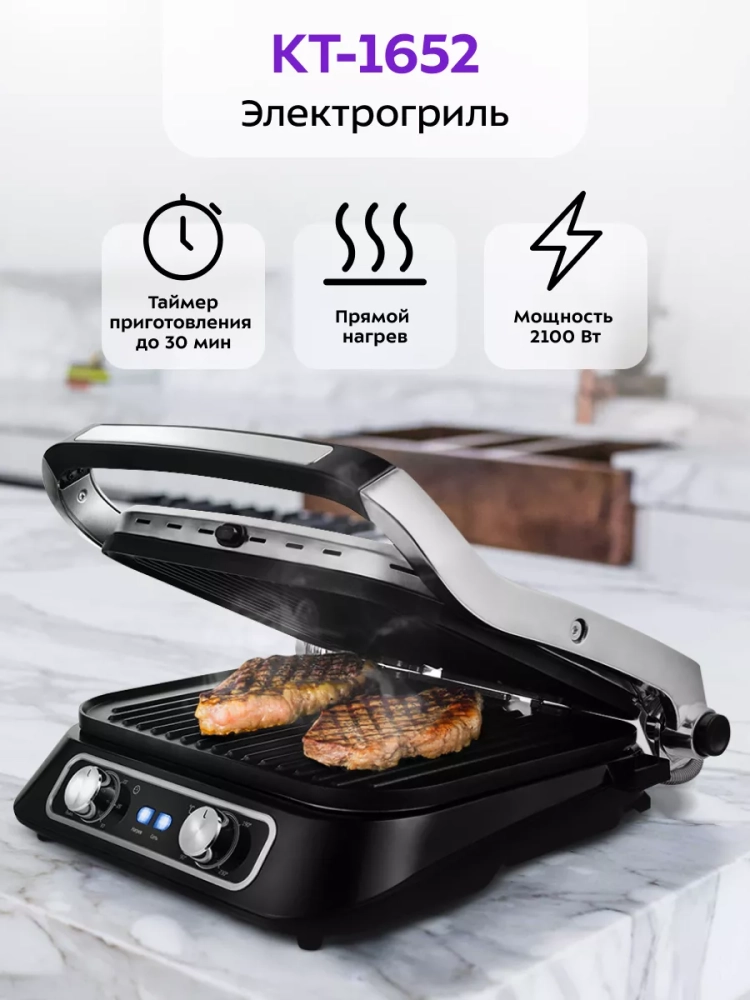 Электрогриль КТ-1652 двусторонний гриль электрический 2100Вт