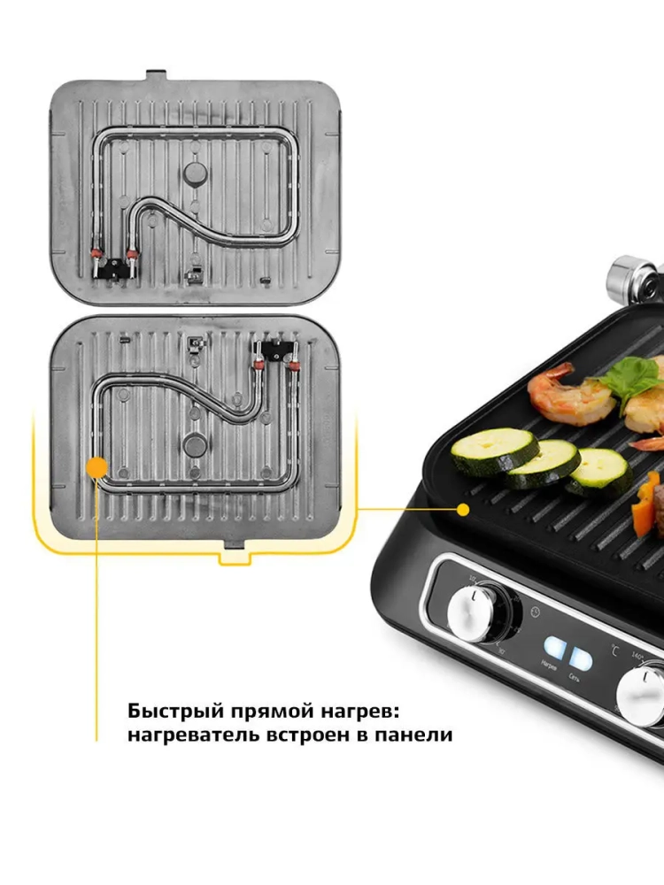 Нагревательные панели изготовлены из алюминия с нанесенным антипригарным покрытием. Благодаря конструкции панелей со встроенными нагревателями, нагрев и передача температуры на поверхность происходит эффективнее, а время прогрева и приготовления сокращается.