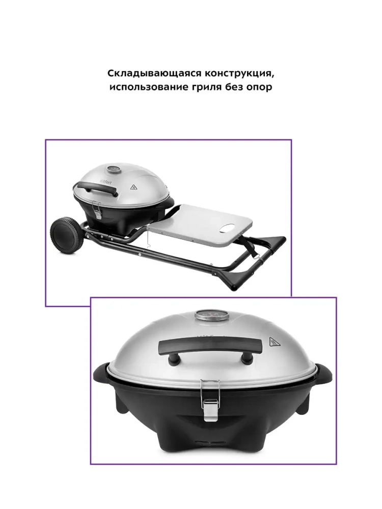 Электрогриль Kitfort КТ-1657 BBQ Master совмещает в себе функционал сразу двух приборов: гриля и барбекю. Благодаря высоким опорам прибору не нужна дополнительная поверхность для установки вроде стола. Им можно пользоваться практически везде, где есть доступ к электричеству: на балконе, в гараже, на просторной кухне и даже на улице. Опоры гриля легко складываются одним движением, и конструкция устройства значительно уменьшается. Благодаря колесам прибор можно перемещать без особых усилий. КТ-1657 поможет приготовить мясо, рыбу, бутерброды, панини, сэндвичи, гренки, тосты, овощи и многое другое быстро и вкусно.