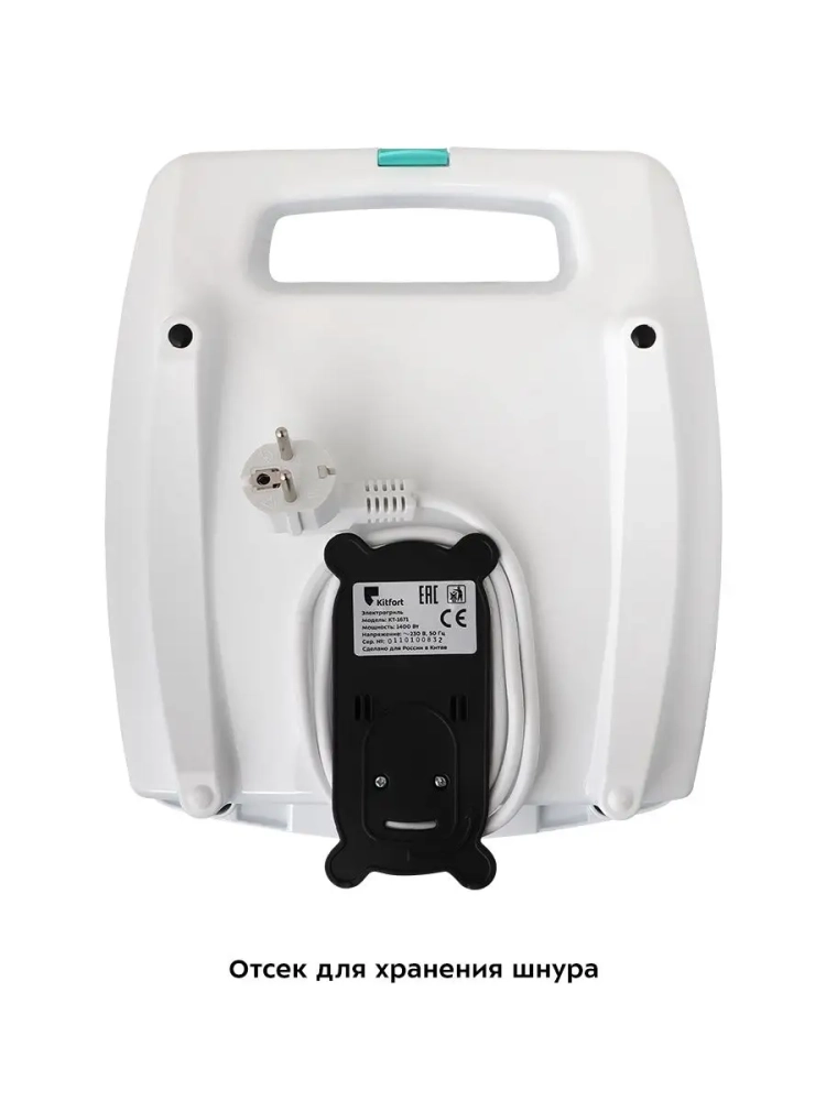 На панели гриля KT-1671 нанесено антипригарное покрытие, что позволяет готовить с минимальным количеством масла или без него. Также антипригарное покрытие панелей облегчает чистку, что особенно важно, так как панели являются несъемными. Гриль оснащен термостатом для поддержания температуры панелей, а также индикаторами питания и нагрева. Противоскользящие ножки не дают прибору скользить по столу во время готовки. Корпус выполнен из пластика. Держатель шнура на нижней части корпуса обеспечивает удобство переноски и хранения. Зажим на ручке удерживает крышку электрогриля в закрытом состоянии, поэтому зажим удобен в готовке, транспортировке и хранении.
